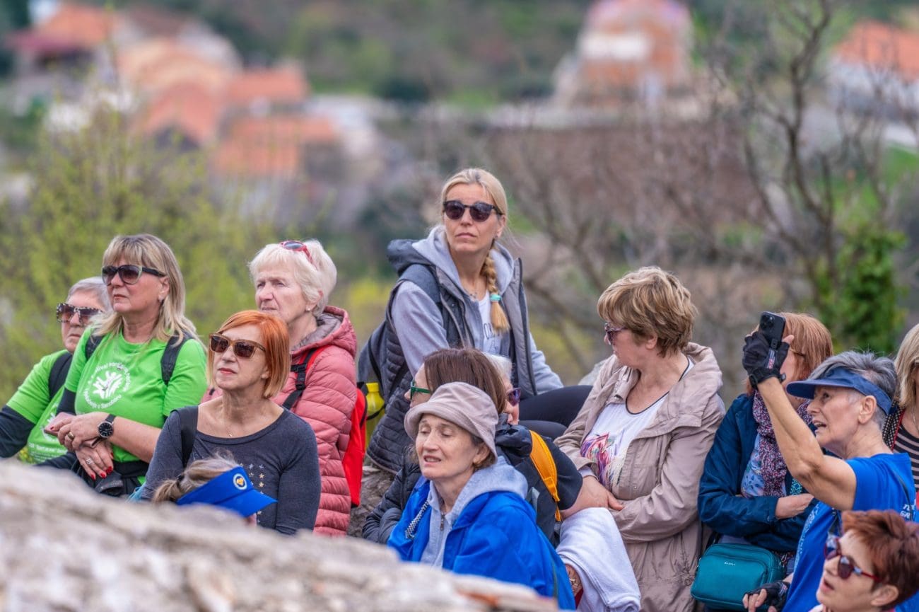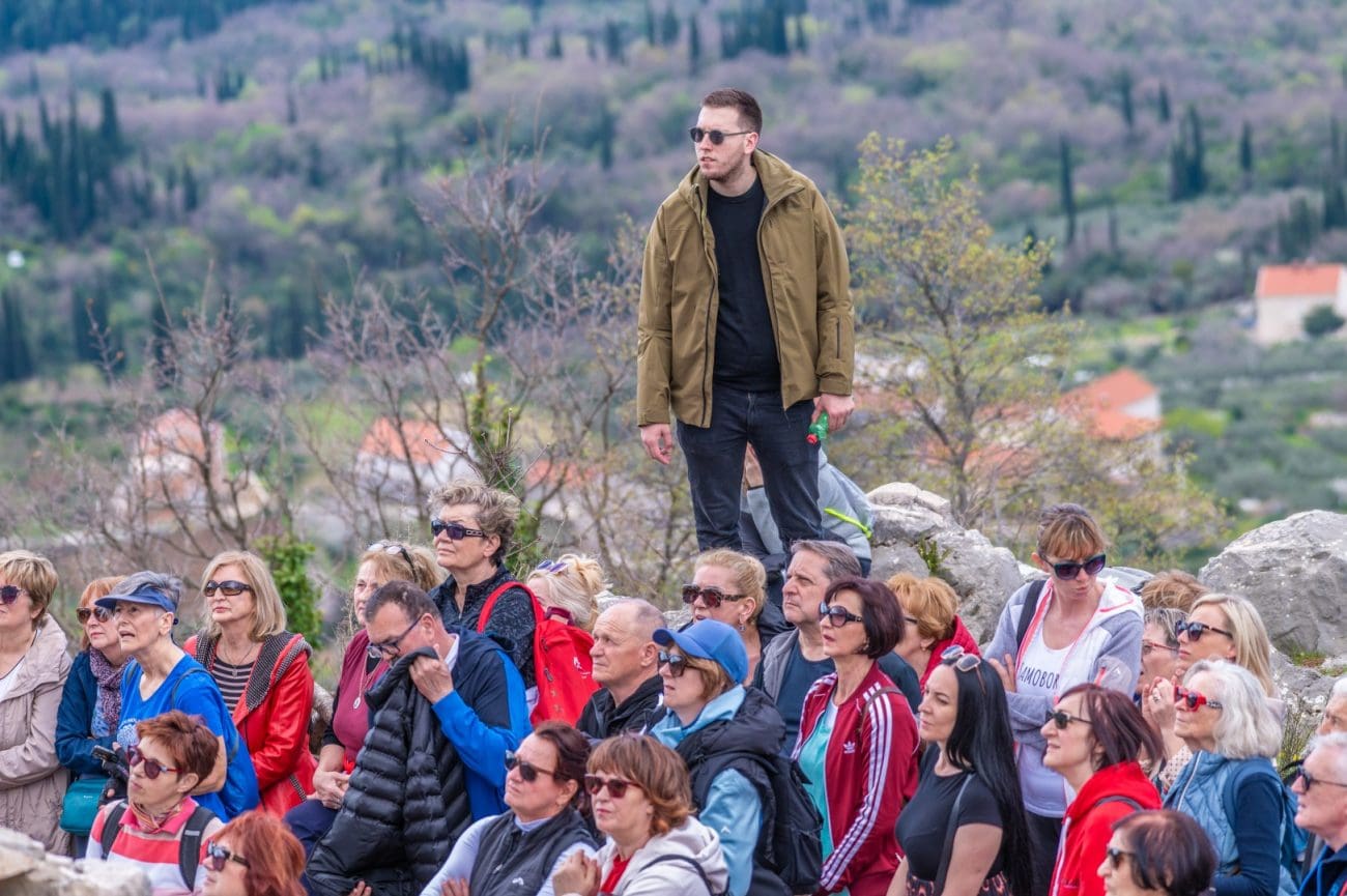 Na vidikovcu pod križem pokazuje panoramu: Gornja banda, Konavosko polje, Donja banda i daleka Sniježnica. Podsjeća da je polje nekad bilo močvarno, a brda su vrvjela stokom i karavanama Dubrovačke Republike. „Stećci su podsjetnik da se središta moći selila – danas je obala skupa, a tada nitko nije htio živjeti na rubu litice.“