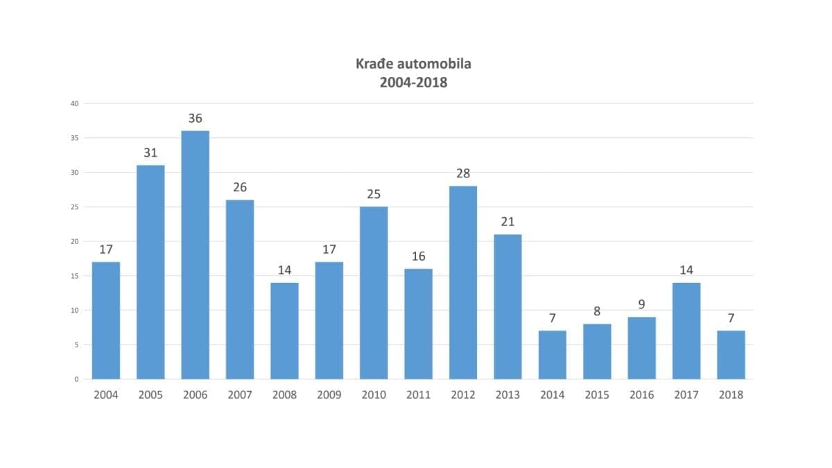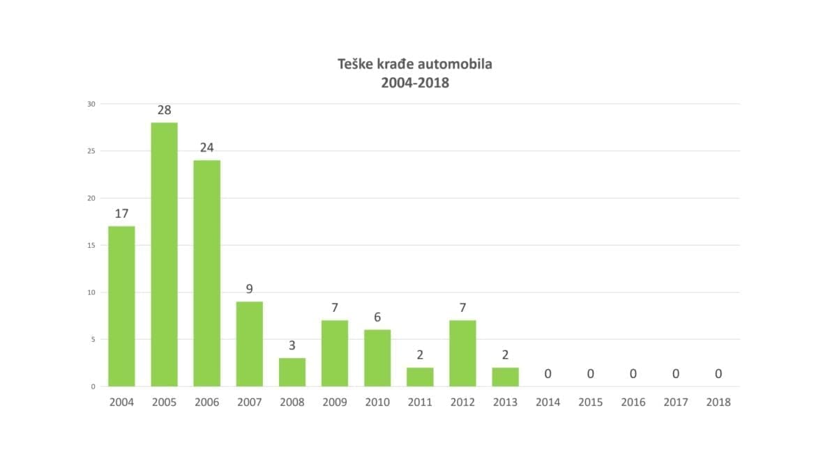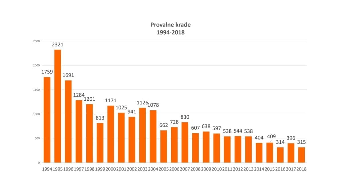 Evo nekih od podataka. U razdoblju od 1994. do kraja 2018. u Splitsko-dalmatinskoj županiji u velikom je padu ukupan broj kaznenih djela. Primjerice, 1995. ih je bilo 5671, a 2018. 1930, što je pad od skoro 300 posto! Još drastičniji je pad broja provala i krađa. 1995. ih je bilo 2321, a 2018. 315. 2006. je ukradeno 36 automobila, a 2018. 7.