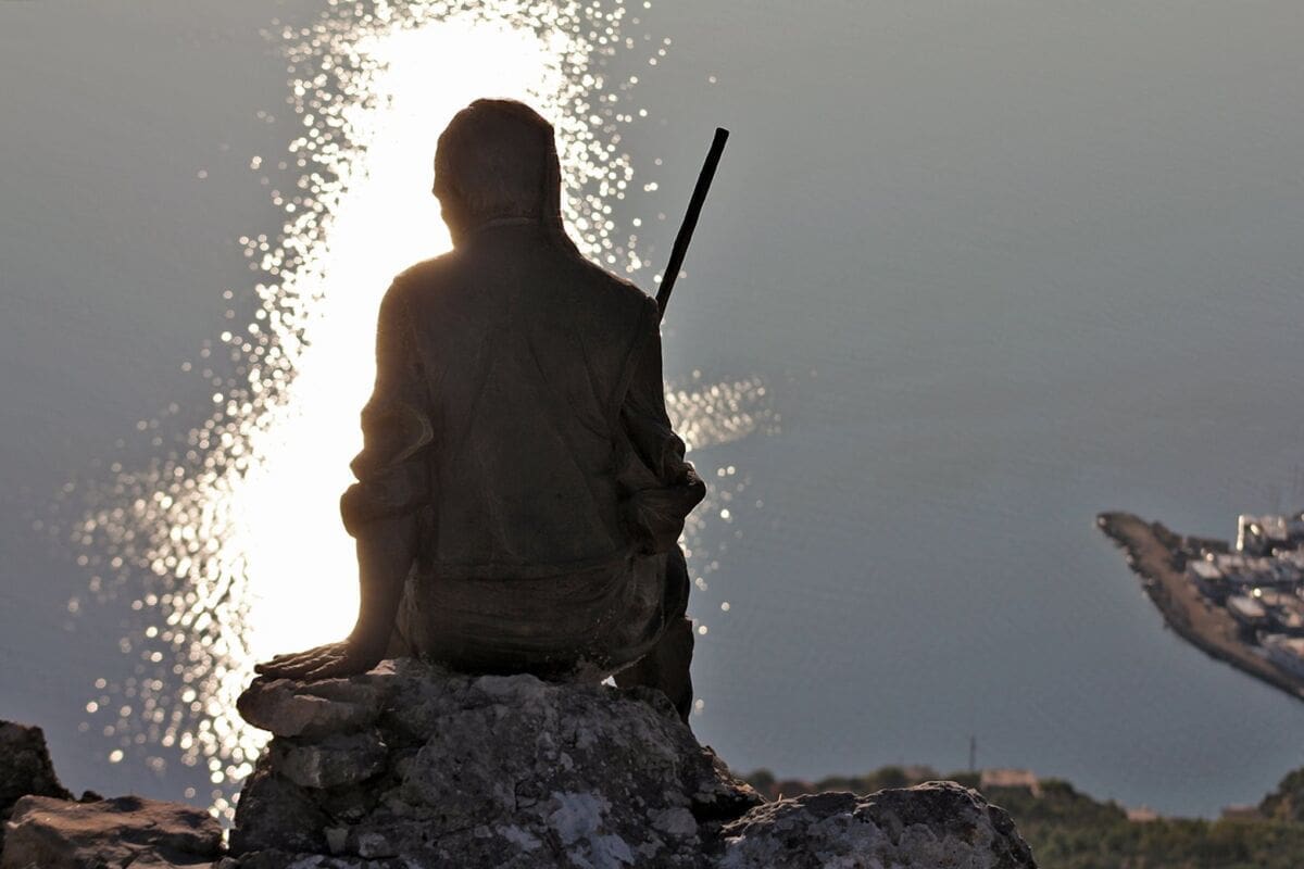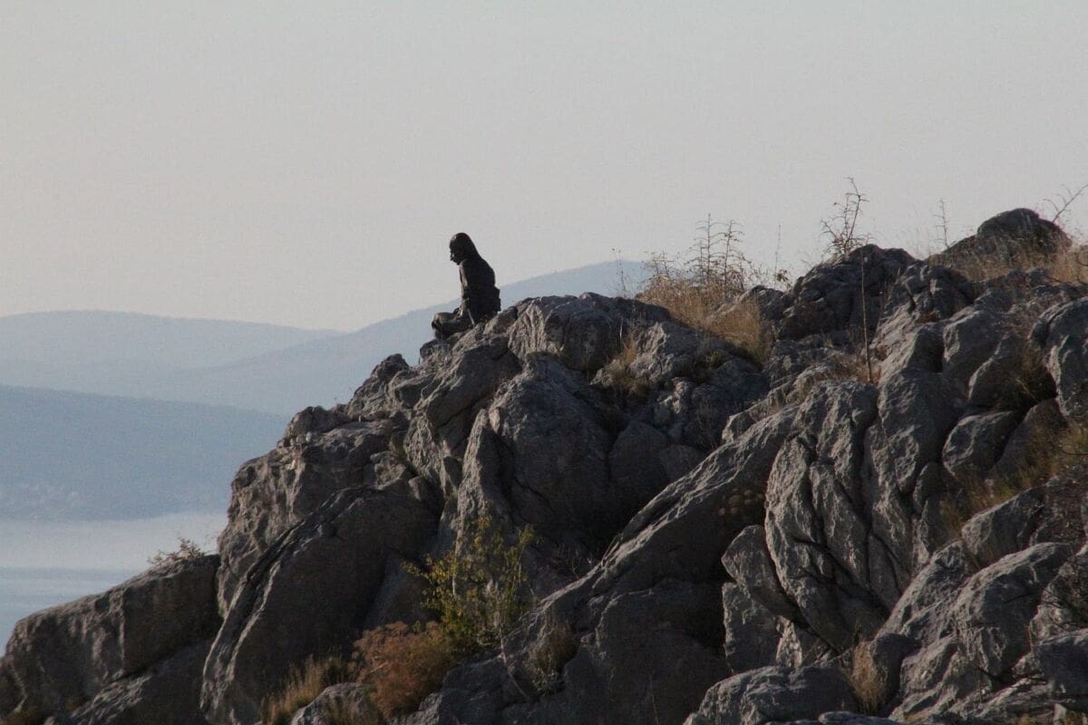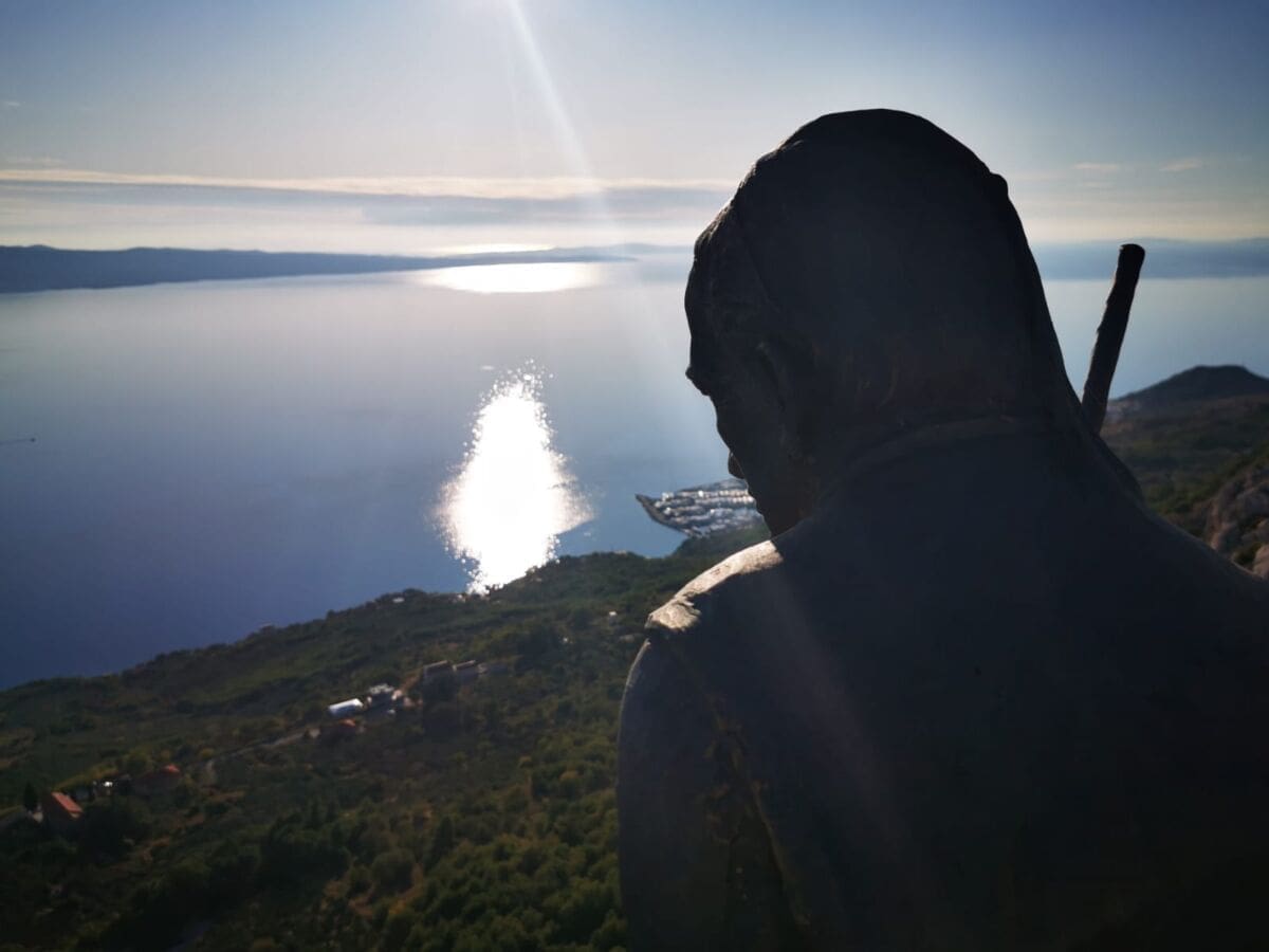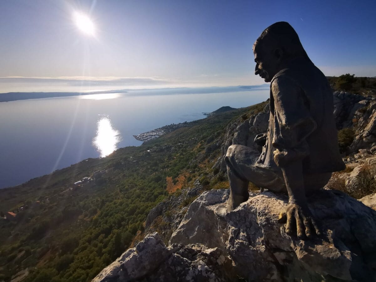 A na jednoj stijeni na samom grebenu, visoko iznad litica, sjedi čovjek odjeven u tradicionalnu poljičku odjeću i gleda prema moru, prema Donjim Poljicima. Iz daleka se teško razaznaje je li na stijeni sjedi čovjek i uživa u pogledu, no približavanjem postaje jasno da se radi o kipu.