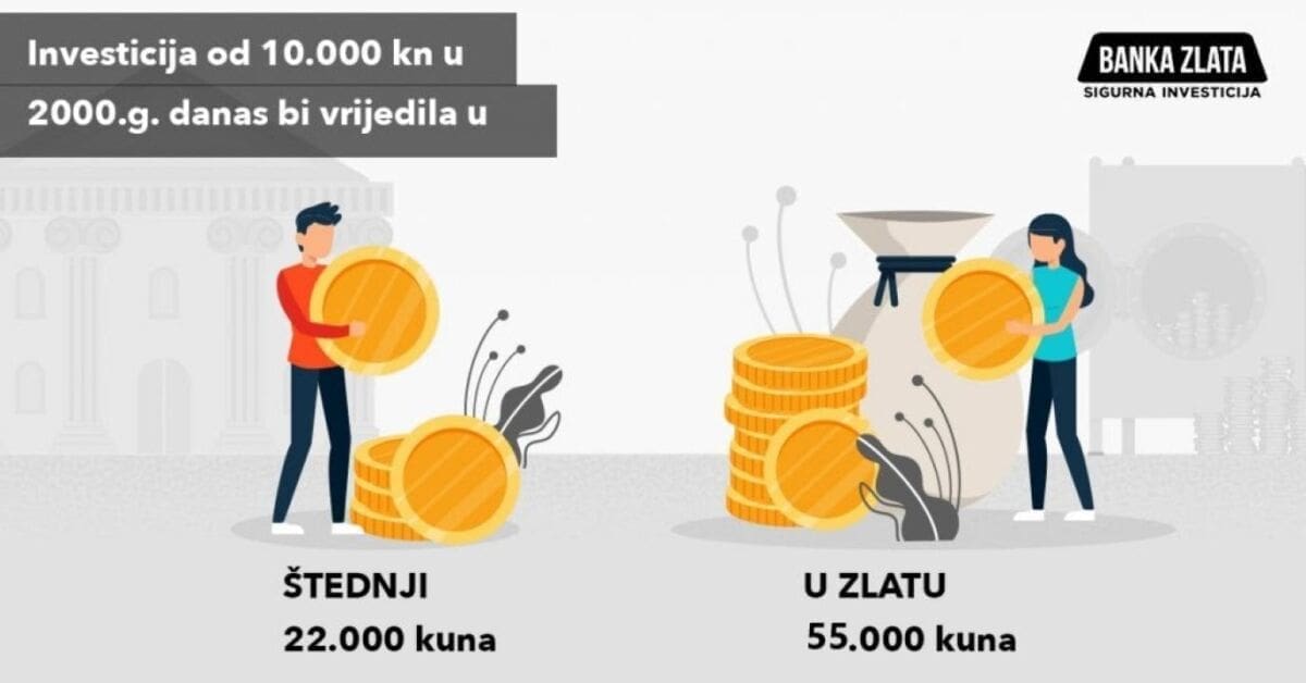 “Dok štediše u banci svake godine efektivno gube vrijednost svoje štednje zbog inflacije, štediše u zlatu dobivaju na vrijednosti jer je cijena zlata u prosjeku rasla oko 9% godišnje u zadnjih 20 godina. Pojednostavljeno rečeno, onaj tko je 2000. godine na oročenu štednju stavio 10.000 kuna, danas će od toga imati nešto više od 20.000 kuna. Onaj tko je tih 10.000 kuna uložio u zlatne poluge i zlatnike, danas će imati vrijednost veću od 55.000 kuna. Jasno je stoga zašto se sve više ljudi okreće zlatu.”
