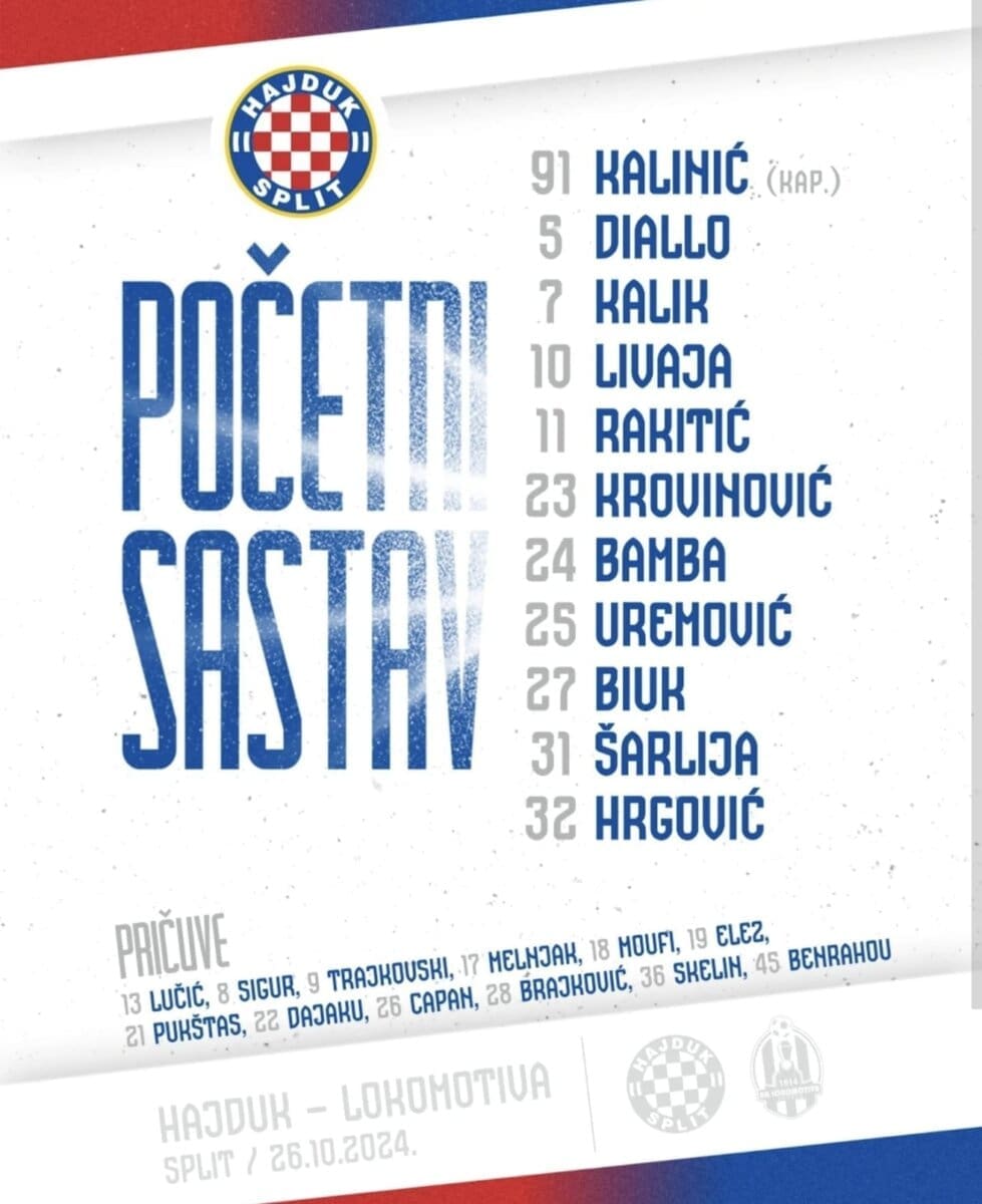 U nastavku pogledajte sastav Hajduka: