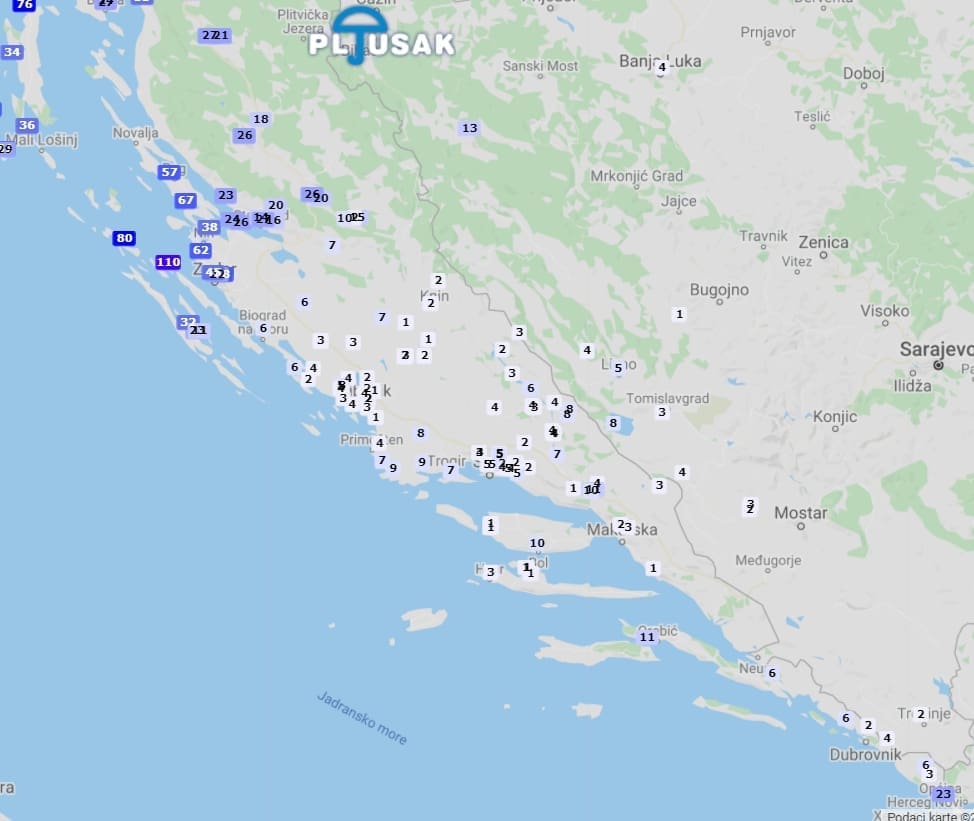 Upravo je zadarskim arhipelagom u ponedjeljak navečer prošao grmljavinski oblak, donoseći obilne oborine. Kasnije navečer kiša se postupno proširila na srednju Dalmaciju, a nakon nekoliko tjedana pauze grmljavina je detektirana kod Visa.