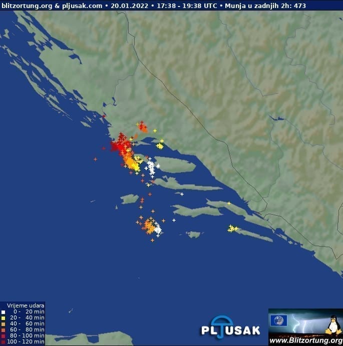 Fronta je stigla do srednje Dalmacije u večernjim satima pa je na području od Rogoznice do Šolte bilo i jačih pljuskova s grmljavinom. Iza 19 sati grmljavinski oblaci primakli su se Braču i Hvaru.