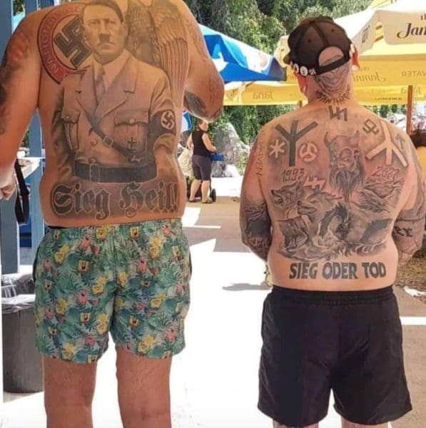 Dvojica muškaraca viđena su u Rijeci u jednom beach baru prekriveni tetovažama s nacističkim obilježjima. Nacistički simboli su im na torzu, leđima, licu, rukama, nogama...