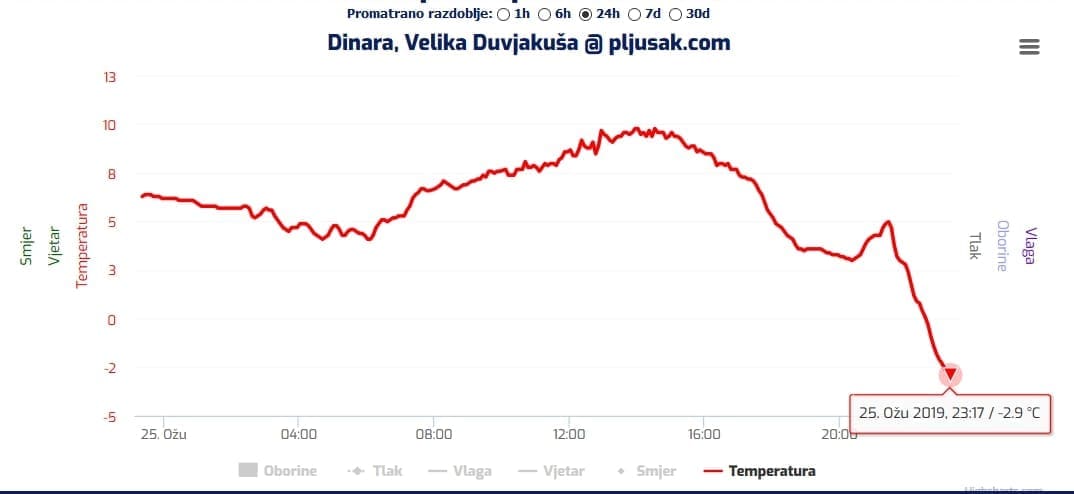 Kasno navečer hladna fronta stigla je do Zagore gdje je tek počeo pad temperature zraka. Na Velikoj Duvjakuši na Dinari u 23 sata temperatura je pala na -3°C i počeo je padati snijeg.