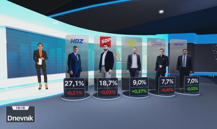 "Petorku" koja sigurno ulazi u Sabor predvodi HDZ s 27% biračke potpore. Gotovo 8,5 postotnih bodova manje ima SDP - 18,7. Treća politička snaga u zemlji je Možemo! Trenutačno ima točno 9%. Za četvrto, odnosno peto mjesto bore se Domovinski pokret sa 7,7 i Most sa 7 posto.