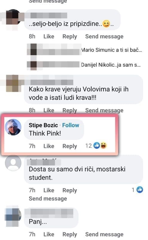 Na komentarima na Facebook zidu Dalmacije Danas vezano uz vijest, odnosno izjavu Bože Petrova o ljubičastim kravama, javio se i Stipe Božić, HDZ-ov gradski vijećnik u posljednja dva mandata. Mostovom šefu odgovorio je samo s dvije riječi: