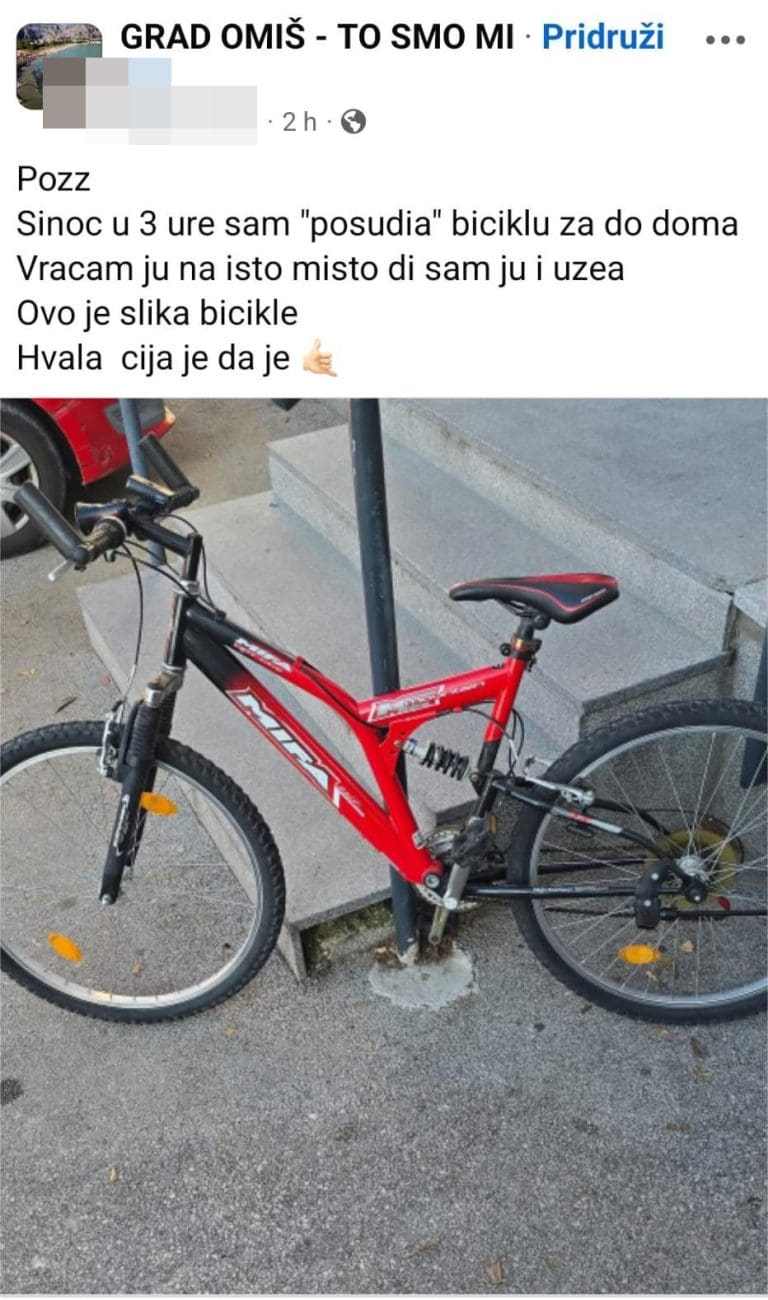 U Facebook grupi “Grad Omiš – to smo mi” jutros, oko 10:30 pojavila se objava od člana koji je oko 3 sata ujutro 'posudio' biciklu kako bi se vratio doma.