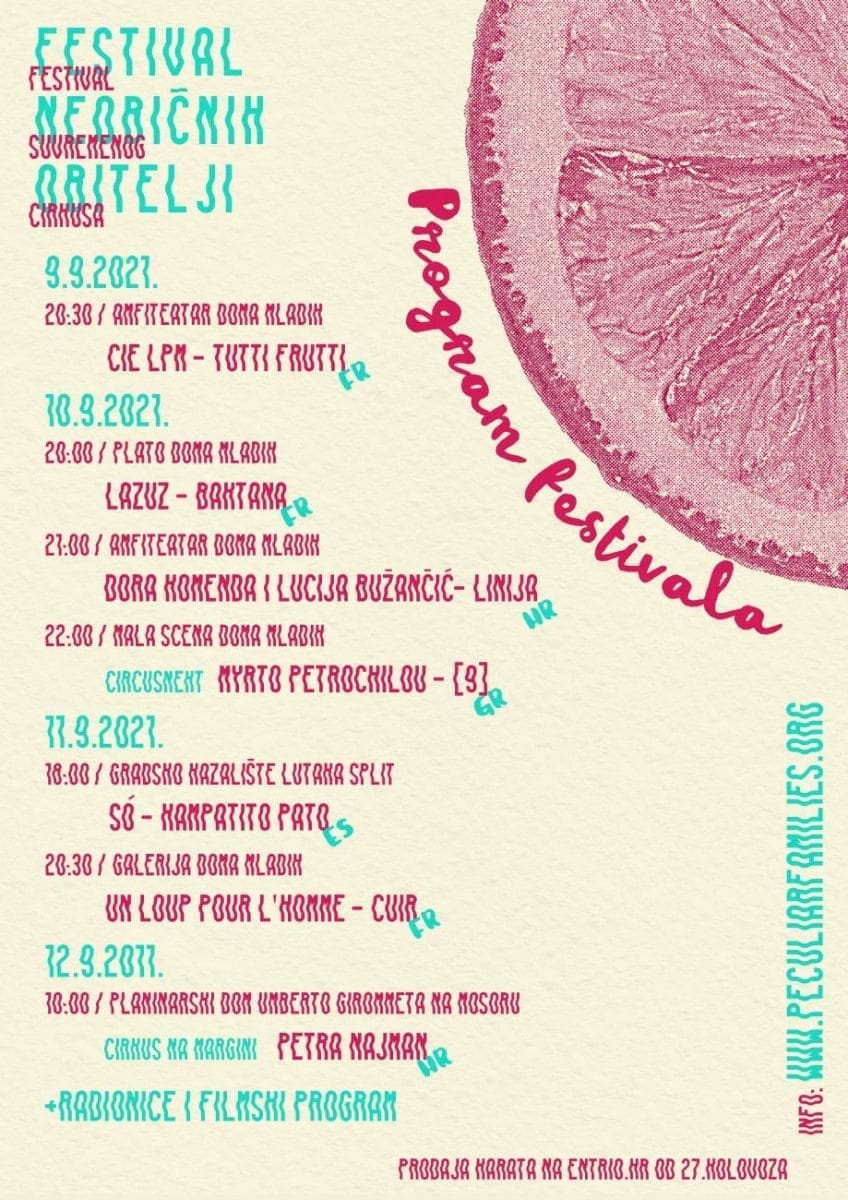 Predstava “Tutti Frutti”, koja je okarakterizirana kao kombinacija Monty Phytona, Tarantinovih filmova i Crne Guje, otvara ovogodišnji festival! Ovaj miks akrobatike, žongliranja, plesa, glazbe, borilačkih vještina, hipnoze, penjanja, grafita i filmova jedna je od najizvođenijih predstava suvremenog cirkusa u 2020. i 2021. godini. Kombinacija smijeha, zabave i vratolomija koja nam svima treba!