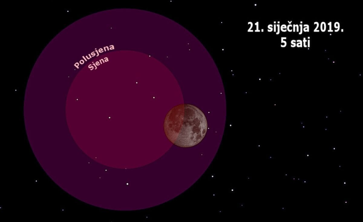 Mjesec će početi ulaziti u sjenu našeg planeta u 4.33 h, dok će potpuna pomrčina započeti u 5.40 h. Izlazak Mjeseca iz sjene započinje u 6.43 h, ali trenutak potpunog izlaska našeg prirodnog satelita iz sjene neće biti vidljiv iz naših krajeva jer će u tom času Mjesec već biti ispod obzora.