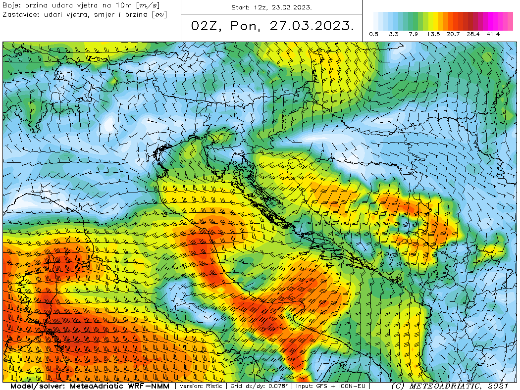 Frontalni sustav premještat će se preko našeg područja u ponedjeljak. On donosi vrlo promjenjivo vrijeme, povremeni uz kišu, a u planinama će biti i snijega. Jugo će već ujutro prelaziti u tramontanu koja na moru može imati vrlo jake do olujne udare, navečer i na jaku buru s olujnim udarima. Lokalno će pasti preko 30 litara kiše po kvadratnom metru, a moguće je i jače grmljavinsko nevrijeme s tučom. Oborine će krajem dana postupno prestajati. Ujutro toplo, a popodne i osobito navečer osjetno zahlađenje.
