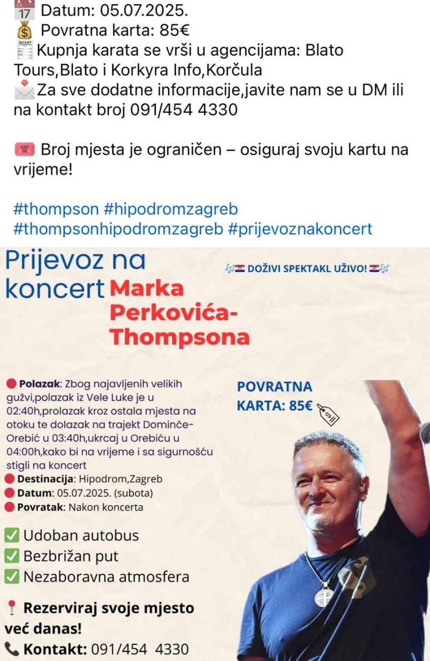 U jednom oglasu stoji kako je polazak na dan koncerta iz Benkovca-Biograda- i Zadra. Cijena po osobi je 80 eura. Druga agencija pak nudi prijevoz i cijele Dalmacije.