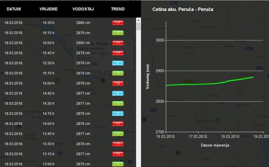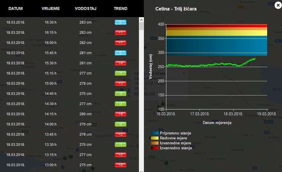 U međuvremenu, vodostaj Cetine i njenih pritoka nastavlja rasti. Cetina na mjernoj postaji Han bilježi vodostaj od 267 cm. Tako nedostaje svega 13 cm da Hrvatske vode proglase redovne mjere zaštite od poplava na tom području. Posljednja 24 sata tako je Cetina u Hanu porasla 15-ak centimetara, a radi se najvećem vodostaju ove godine.