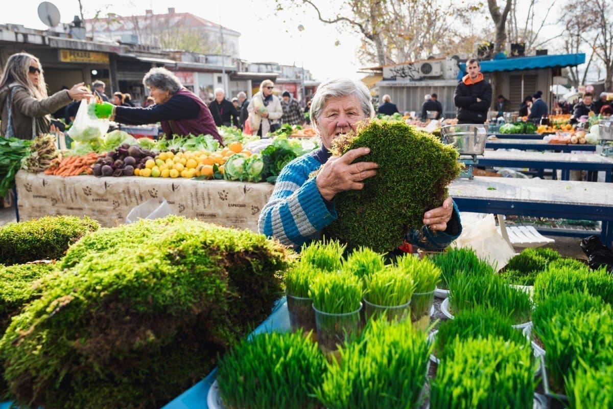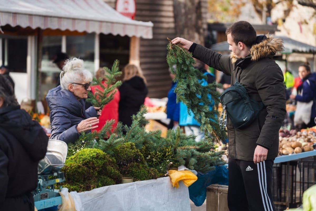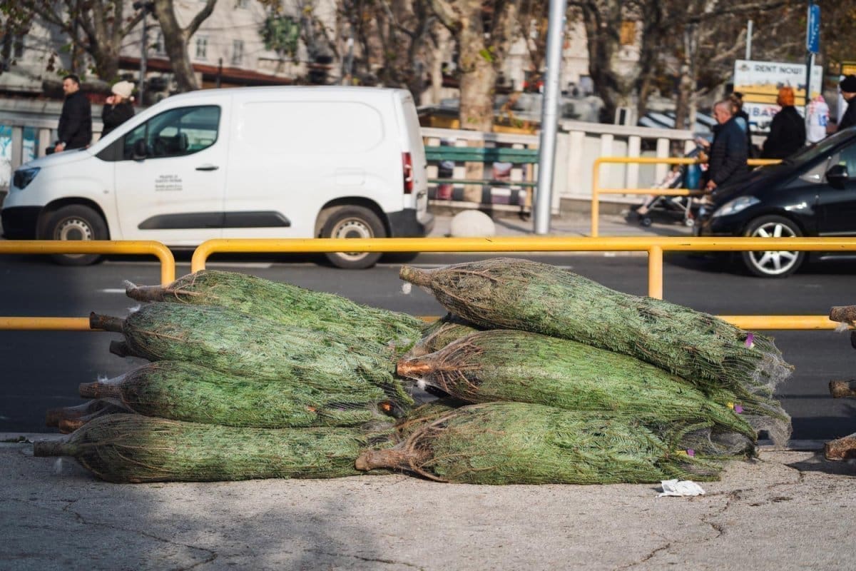 "Maslinovo ulje, domaće. Uzmite", zove nas muškarac s jednog banka, ali nas zanima nešto drugo zeleno. Ne kupus. Mahovina. Ima je tu i tamo, lijepi debeli komadi mahovine, ma već miriše na Božić.