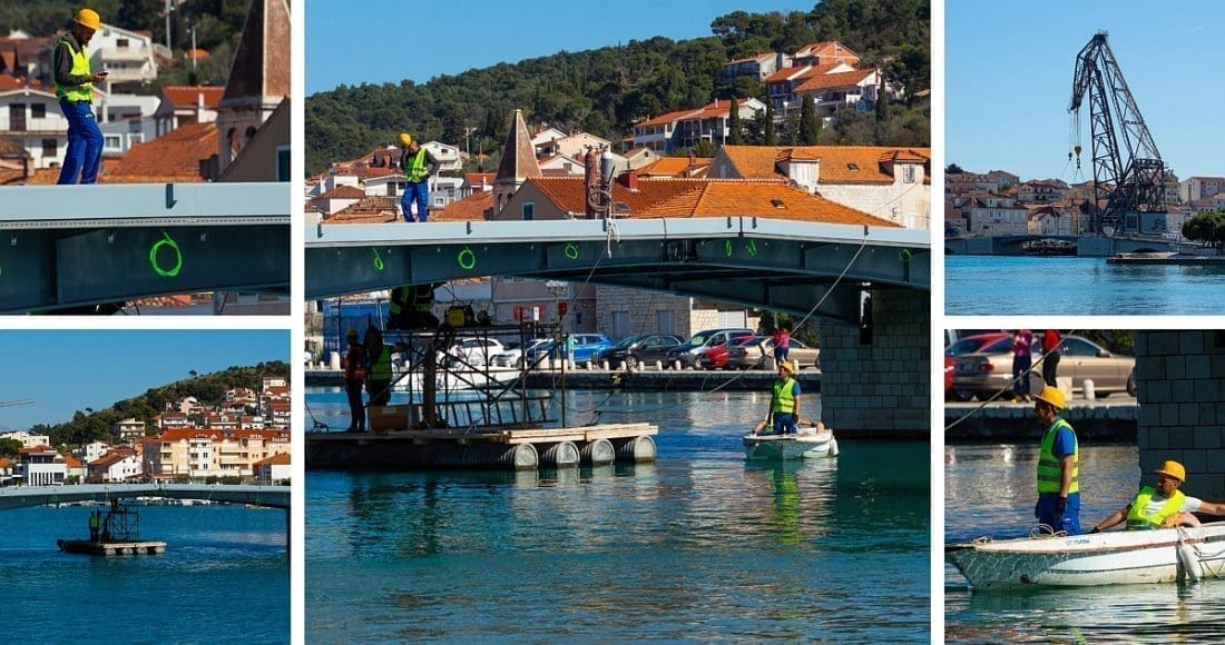 Nakon što je nedavno na mostu montirana čelična rasponska konstrukcija teška stotinjak tona, u tijeku je postavljanje ograde. Podsjetimo, kako su spomenuti radovi izazvali znatiželju posjetitelja te turista koji ljetuju u Trogiru, koje se može svakodnevno zateći kako pokraj ograde gradilišta promatraju što se na njemu odvija te fotografiraju zanimljive prizore.