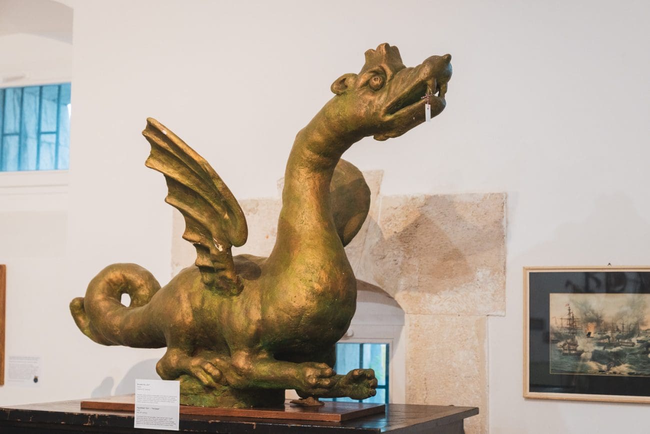 U dvorištu Tvrđave Gripe posjetitelje dočekuju impresivni vanjski izlošci: pramac parobroda Bakar, gajeta Perina iz 1857. godine – jedno od najstarijih sačuvanih plovila na istočnoj obali Jadrana – te niz drugih predmeta koji privlače pažnju već pri samom ulasku.