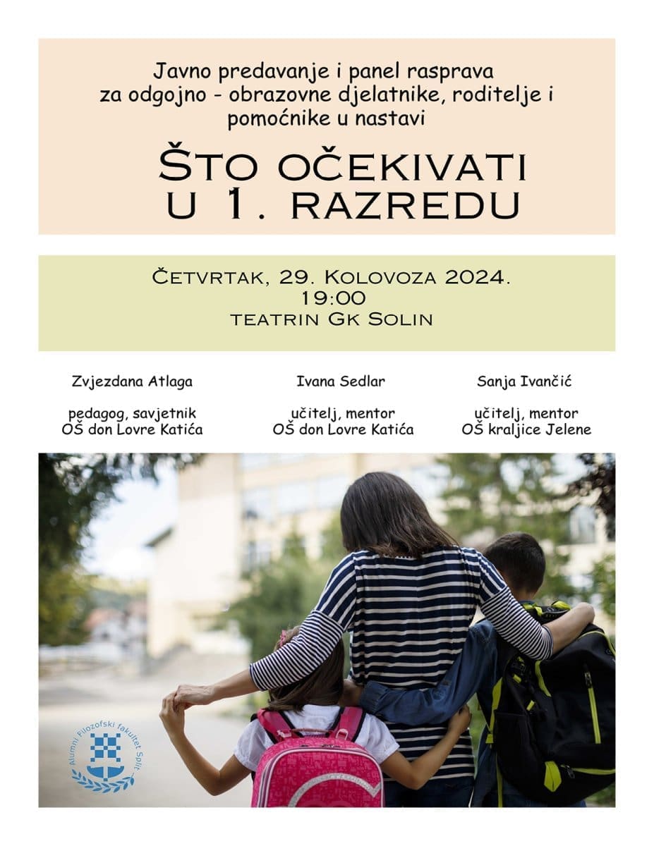Alumni Filozofskog fakulteta iz Splita organizira u Teatrinu Gradske knjižnice Solin u četvrtak, 29. kolovoza s početkom u 19 sati javno predavanje i panel raspravu za roditelje, asistente u nastavi te odgojno - obrazovne djelatnike na temu "Što očekivati u 1. razredu".