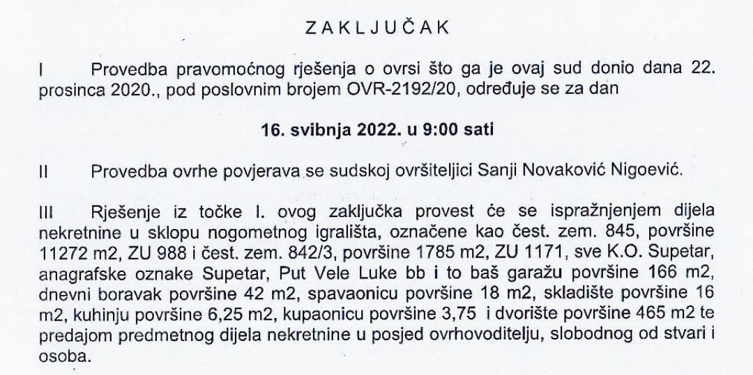 Podsjetimo, Općinski sud u Splitu je 5. svibnja okončao sagu oko starog vatrogasnog doma te donio odluke kako će se u ponedjeljak, 16. svibnja, provesti pravomoćno rješenje o ovrsi temeljem kojeg će Svpetrvs hoteli d.d. biti uvedeni u posjed prostora starog vatrogasnog doma i boćališta u Supetru, u čijem su nespornom vlasništvu, a što su tvrdili prilikom nemilih događaja koji su se događali u travnju", zaključili su iz Svpetrvs hotela d.d. (Uprava Društva).