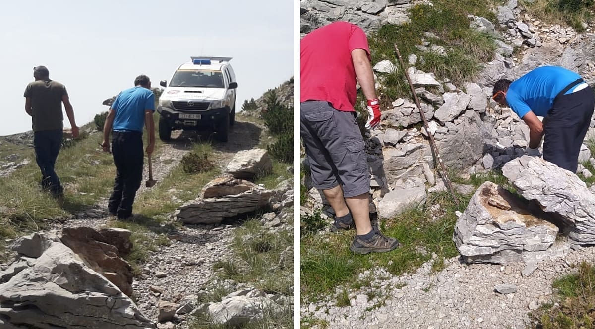 Nakon što su dobili dojavu o urušenim kamenim gromadama na putu prema planinarskom skloništu “Pume” podno Duvjakuše na Dinari, članovi HGSS Stanice Split izašli su na teren.