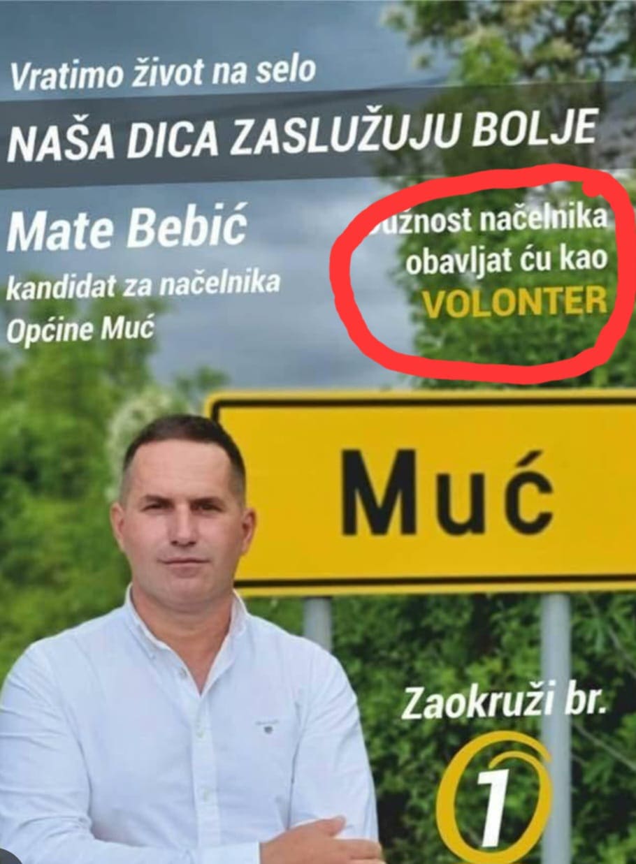 Novoizabrani načelnik Mate Bebić s plakata je u predizbornoj kampanji obećavao da će dužnost načelnika obavljati volonterski. Po zakonu, ukoliko gradonačelnik ne zasniva radni odnos, njegova naknada može iznositi 50% maksimalne plaće načelnika.