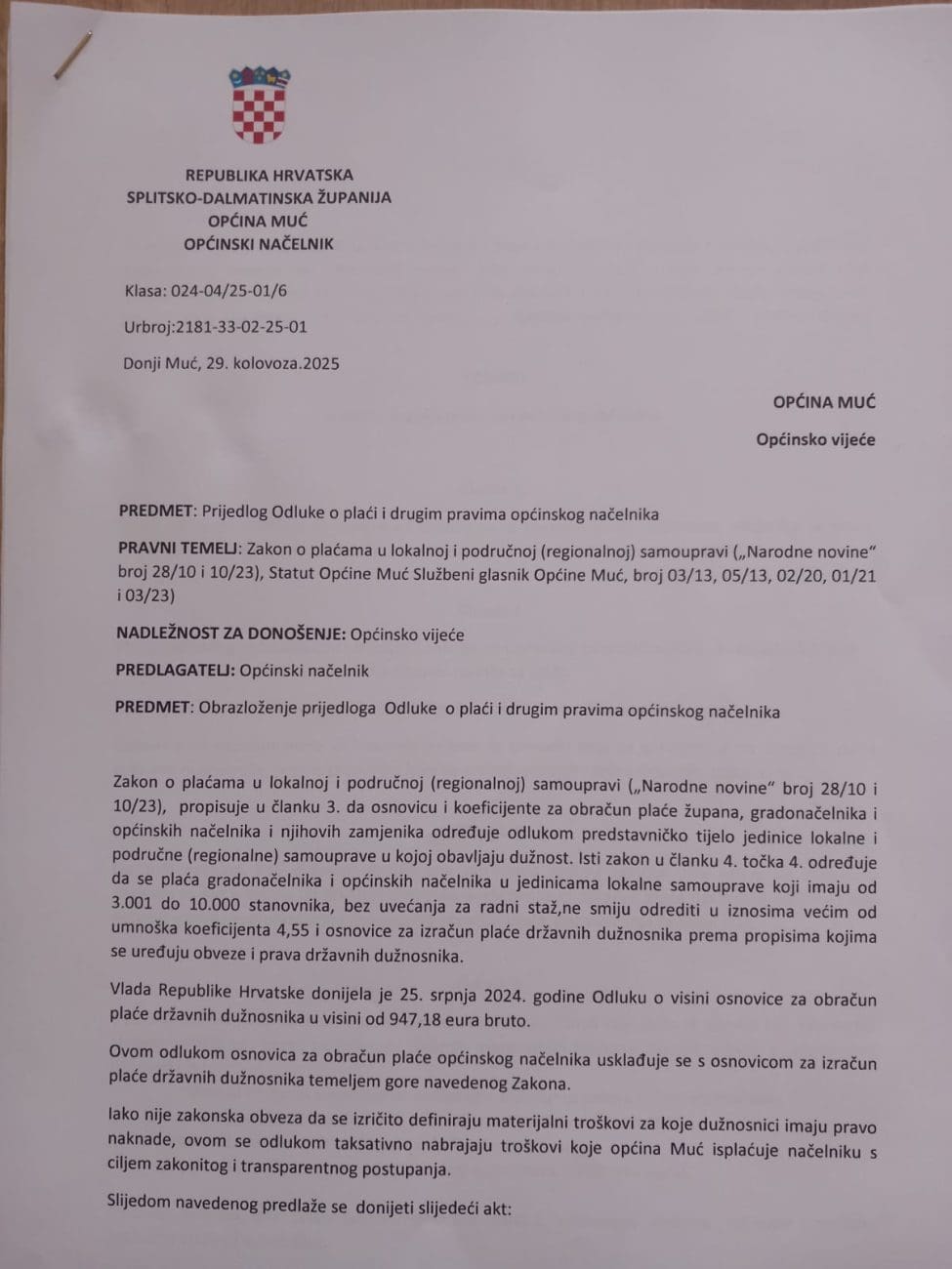 Po zakonu, načelnici općina koje imaju od 3000 do 10 000 stanovnika mogu primati maksimalnu plaću koja se dobije umnoškom osnovice od 947 eura pomnožene s koeficijentom koji može iznositi maksimalno 4.5. U Muću su odlučili da će to biti koeficijent od 4.45, odnosno da će plaća načelnika biti 4080 eura.