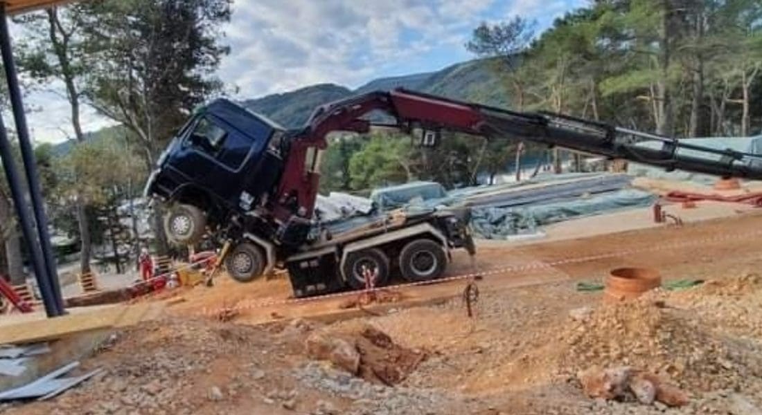 Nezgoda se dogodila na jednom gradilištu, a velika oštećena pretrpjelo je teretno vozilo s dizalicom. Naime, kako je vidljivo, dizalica se slomila, a zbog velike težine se kabina vozila dignula u zrak.