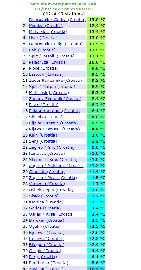 Na razliku od prošlog, aktualni tjedan donosi nam stabilno i hladnije vrijeme. Posljedica je to pritjecanja hladnog kontinentalnog zraka sa sjeveroistoka, no usprkos pojedinim gotovo katastrofičnim najavama, Dalmacije zasad nije iskusila posebno izraženu hladnoću. Tako jučer u nekim dijelovima unutrašnjosti zemlje najviše dnevne temperature nisu prelazile nulu, no u dobrom dijelu Dalmacije bile su iznad 10°C. Primjerice, Čilipi, Komiža, Hvar i Makarska su zabilježili 12°C, a Dubrovnik čak 13°C.