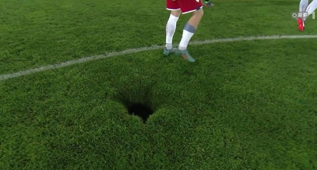 A huge hole appeared on the field after the Austria vs. Denmark game ended last night 😳 pic.twitter.com/1pMUTPYxmt