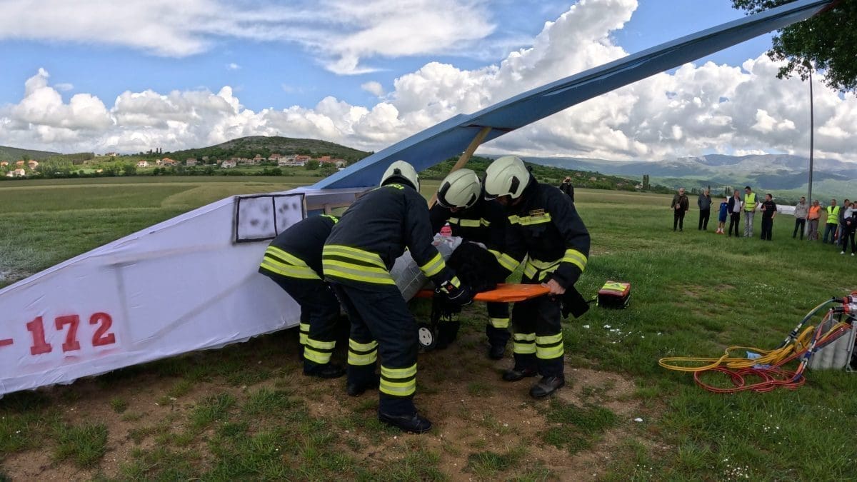 Sukladno scenariju vježbe, prilikom slijetanja avion se znatno oštetio a pilot se ozlijedio i bio u kabini bez svijesti. Uslijedile su intervencije članova aerokluba Sinj u početnom gašenju manjeg požara na avionu a odmah po dolasku pripadnika JVP Sinj, pristupilo se oslobađanju ozlijeđenog pilota koji je izvađen iz olupine i predan pristigloj ekipi HMP na obradu i daljnje postupanje. Vatrogasci JVP Sinj dovršili su gašenje olupine aviona a DVD Sinj pogasio je požar na otvorenim površinama oko same olupine. Cijelo vrijeme pripadnici MUP - a osiguravali su šire područje vježbe i osigurali brz protok vozilima svih žurnih službi.