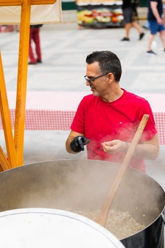 ZAMAMNI MIRISI DOVELI SU NAS I DO TEČE u kojoj se skrivala prava domaća gastro-ikona, a di je teča, tu je negdje i on – Ivan Pažanin. Pravi meštar o' kužine i jedno od najomiljenijih TV lica poželio je da nas pored zamamnih mirisa i okusa poljubi i – lipo vrime, a za početak današnjeg, za Makarsku najukusnijeg svibanjskog dana, vodio je Cooking show zajedno s kolegom Mariom Tomašem, koji je za spravljanje onog što je tako primamljivo mirisalo, kako je Ivan rekao, pravi autoritet! Izbor jela za javno kuhanje nije mogao biti bolji – u pitanju je ikonični Makarski teleći rižot, svatovsko jelo pripreme tako duge i zahtjevne da se ne isplati raditi za manje od sto ljudi, pa se ljubitelji lipih bokuna koji su ga danas marendali - uključujući nas! - mogu smatrati pravim sretnicima.