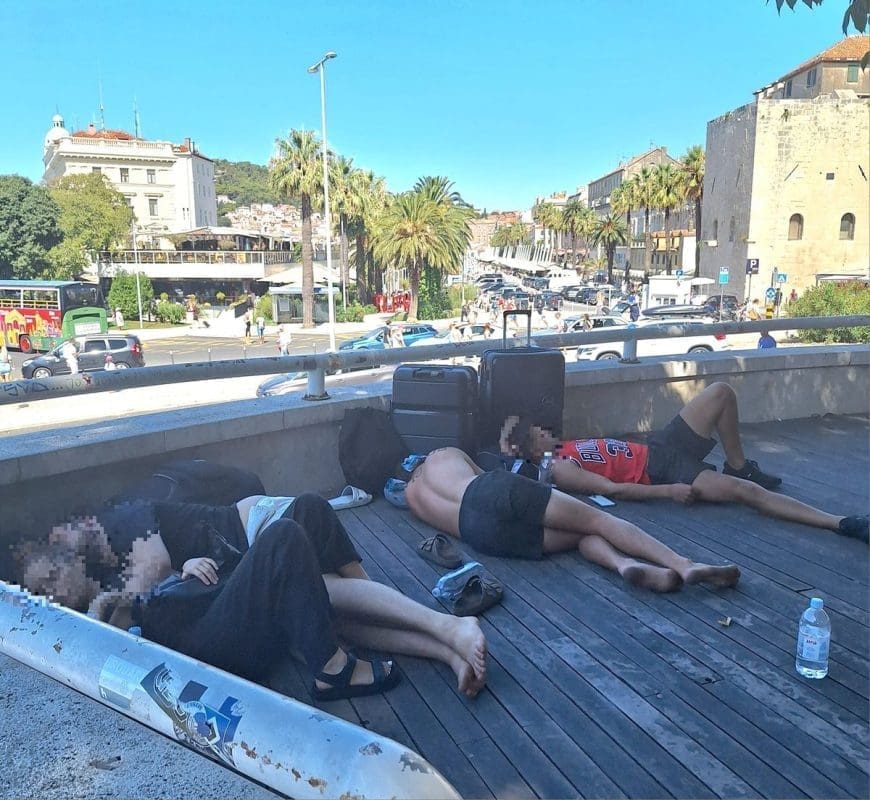 Ova skupina mladih mjesto za spavanac našla je u neposrednoj blizini Trajektne luke Split, a ako je suditi po njihovim tabanima, čini se da je za njima burna noć.