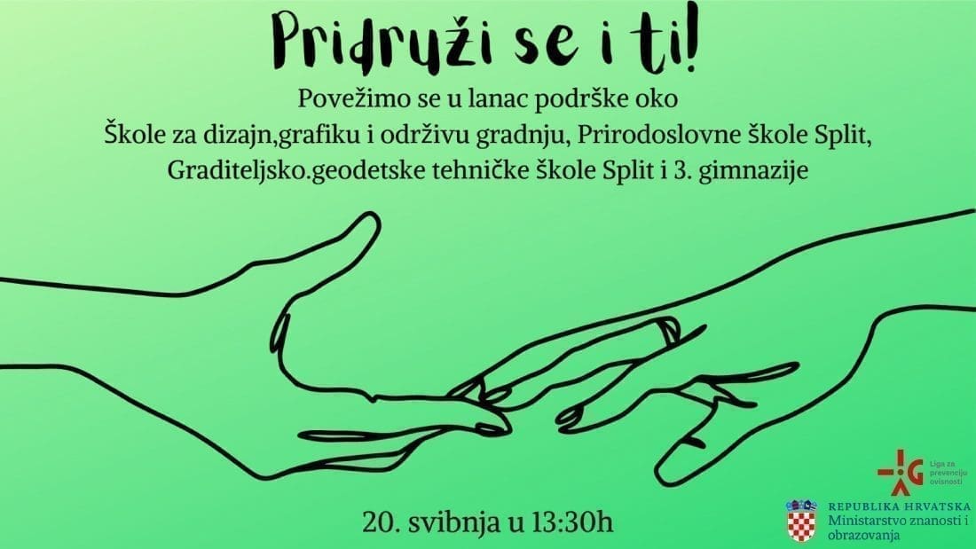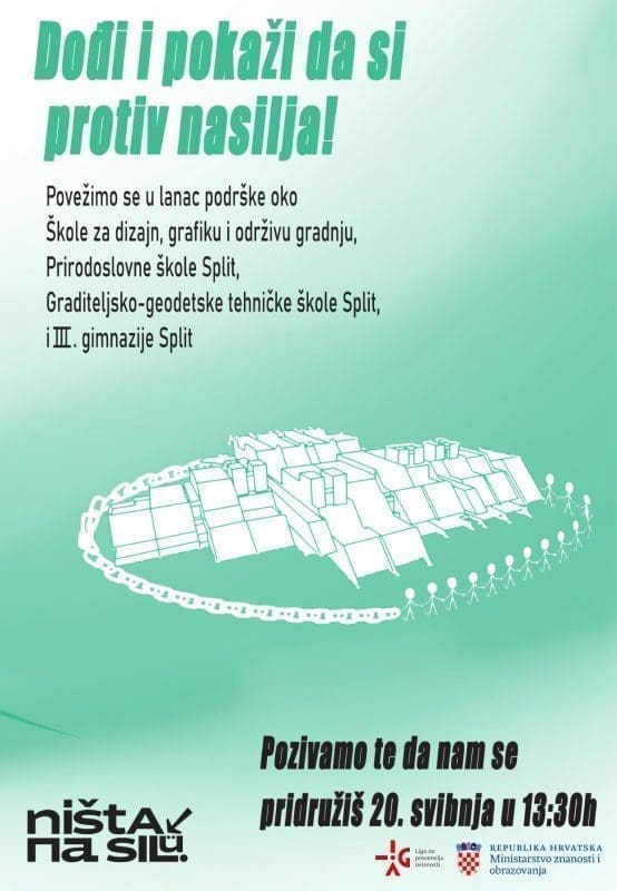 U petak, 20. svibnja 2022. godine u 13.30 sati, učenici četiri splitske srednje škole - Škole za dizajn, grafiku i održivu gradnju Split, Graditeljsko - geodetsko tehničke škole Split, Prirodoslovne škole Split te III. gimnazije Split, rukama će “zagrliti” svoje škole, povezujući se u tako u veliki lanac podrške. Učinit će to da bi simbolički i doslovno poslali snažnu poruku podrške svojim vršnjacima koji trpe nasilje i motivirali ih da potraže pomoć.