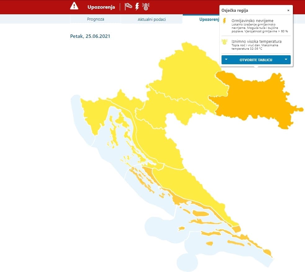 Na području osječke regije očekuje se lokalno izraženije grmljavinsko nevrijeme s mogućom tučom. Na području zagrebačke regije očekuje se lokalno moguć izraženiji grmljavinski pljusak, osobito na sjeveru.