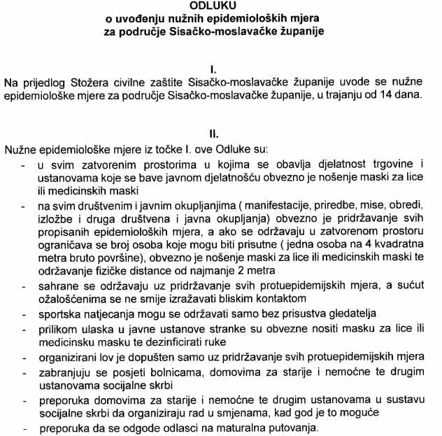 Od sutra na području Sisačko-moslavačke županije te idućih 14 dana na snazi su nužne epidemiološke mjere među kojima je ona da se maske obavezno nose u svim ustanovama koje se bave javnom djelatnošću te se zabranjuju posjeti bolnicama, domovima za starije i nemoćne te drugim ustanovama socijalne skrbi.