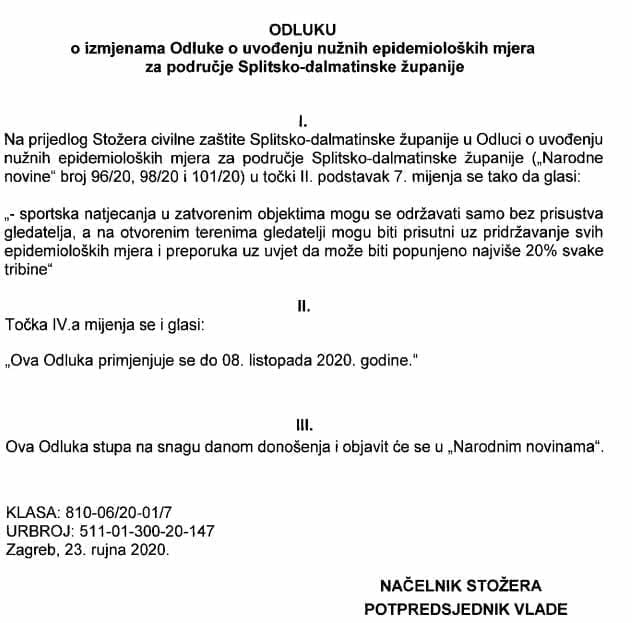 U Splitsko-dalmatinskoj županiji od sutra se sportska natjecanja u zatvorenim prostorima mogu održavati samo bez prisustva gledatelja, a na otvorenom gledatelji mogu biti prisutni uz to što moraju poštivati sve epidemiološke mjere.