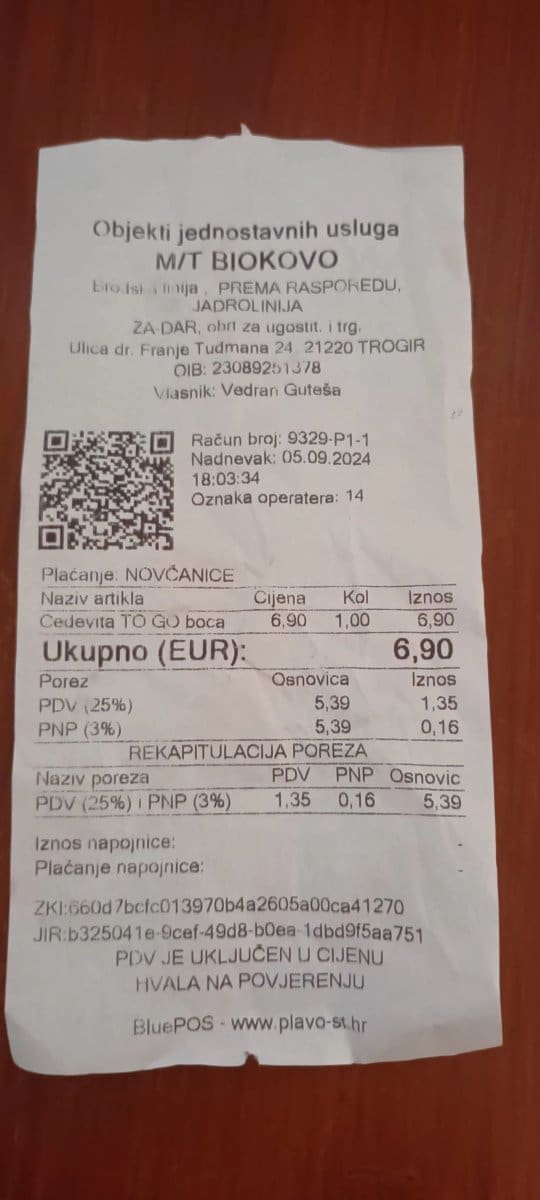 Ekipu na Facebooku šokirala je gospođa koja je objavila račun za Cedevitu u plastičnoj bočici. Cedevitu je, kaže, kupila na trajektu Šolta - Split i platila je - 6.90 eura.