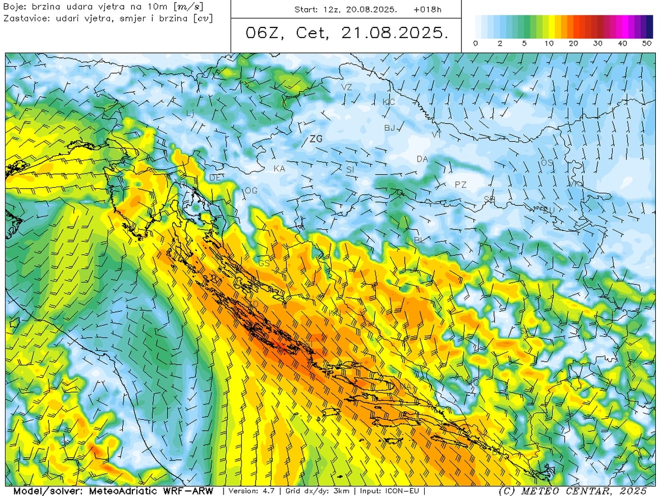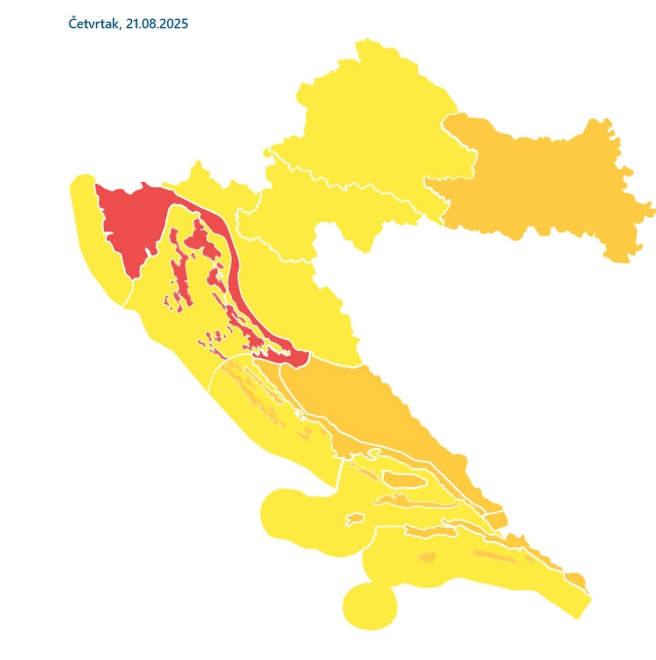 DHMZ je unutar sustava MeteoAlarm za sjeverni Jadran izdao crveni, najveći stupanj upozorenje. Za Dalmaciju vrijedi narančasti i to zbog mogućnosti grmljavinskog nevremena, vjetra i oborina.