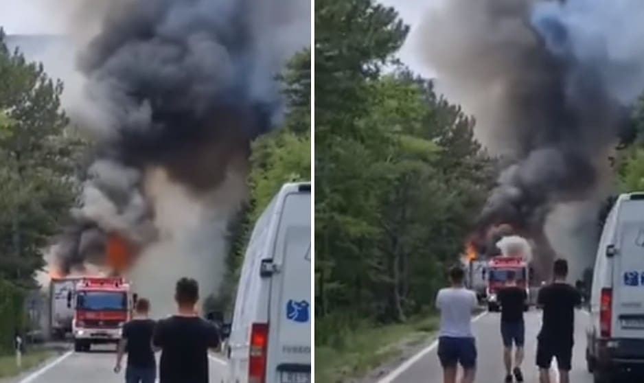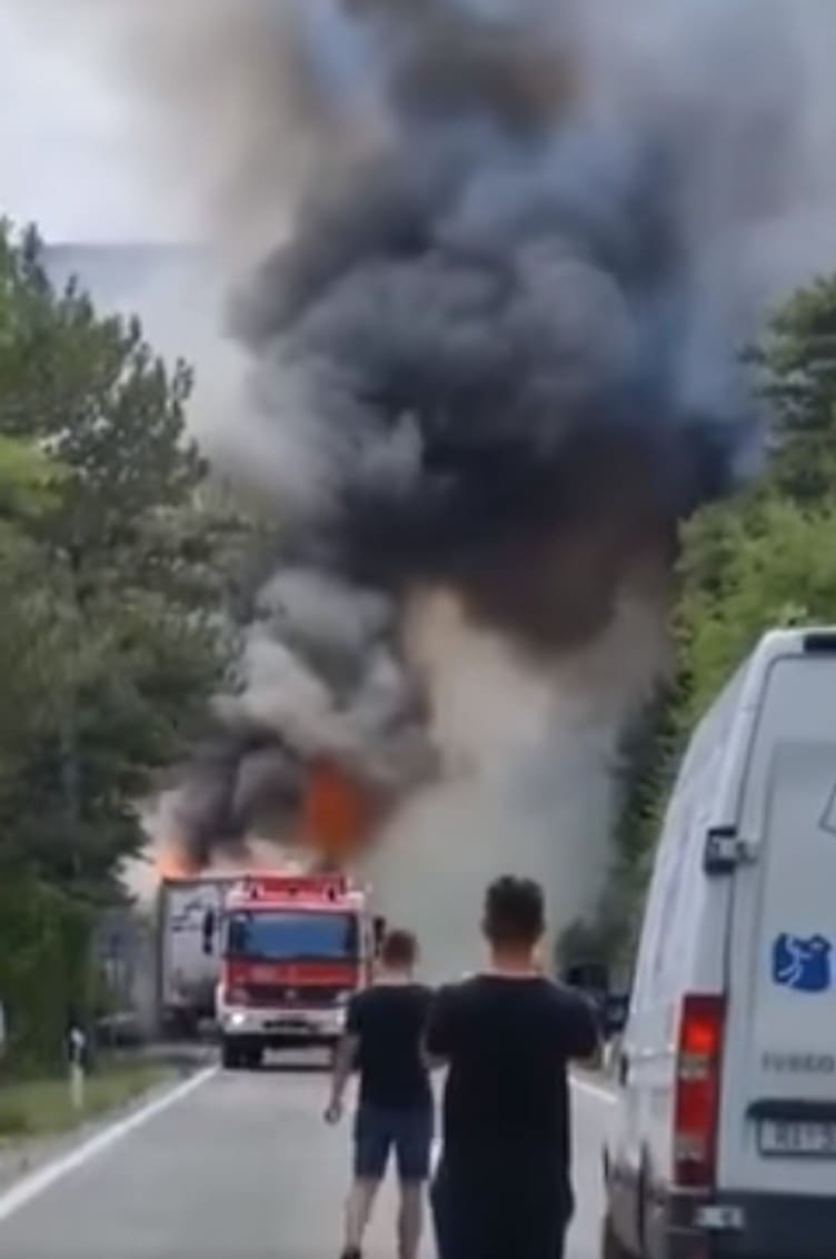 Na snimci je vidljivo plamteće teretno vozilo koje vatra doslovno 'guta'. Na žurnu intervenciju izašlo je nekoliko gasitelja Javne vatrogasne postrojbe Senj, a policija je regulirala promet.