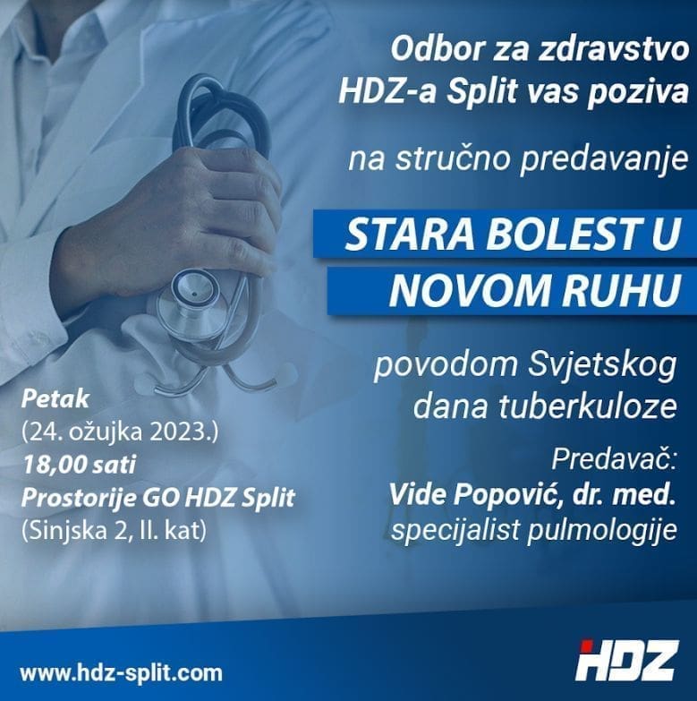 Sljedećeg petka (24. ožujka 2023.) održat će se stručno predavanje specijalista pulmologije Vide Popovića, dr. med. povodom Svjetskog dana tuberkuloze, u organizaciji HDZ-a Split.