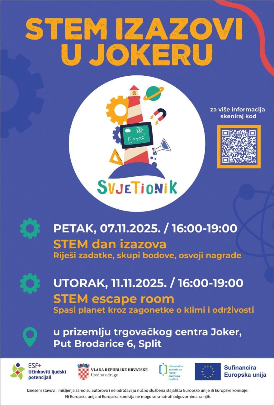 11.studenog 2025. – STEM Escape Room „Spasimo planet” Joker centar, Put Brodarice 6, Split | 16:00 – 19:00Edukativna avantura u kojoj sudionici rješavaju STEM zagonetke kako bi spasili Zemlju od klimatske krize.