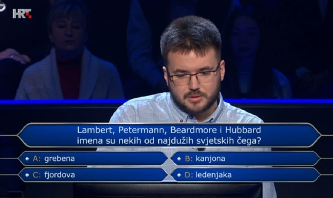 Dvanaesto pitanje, za 18 000 eura, glasilo je: Lambert, Petermann, Beardmore i Hubbard imena su nekih od najdužih svjetskih čega? Grebena, kanjona, fjordova ili ledenjaka? Dominik je odustao od odgovora i kući otišao s 10 000 eura. A da je odgovarao, naveo bi D - ledenjaka što je točan odgovor.