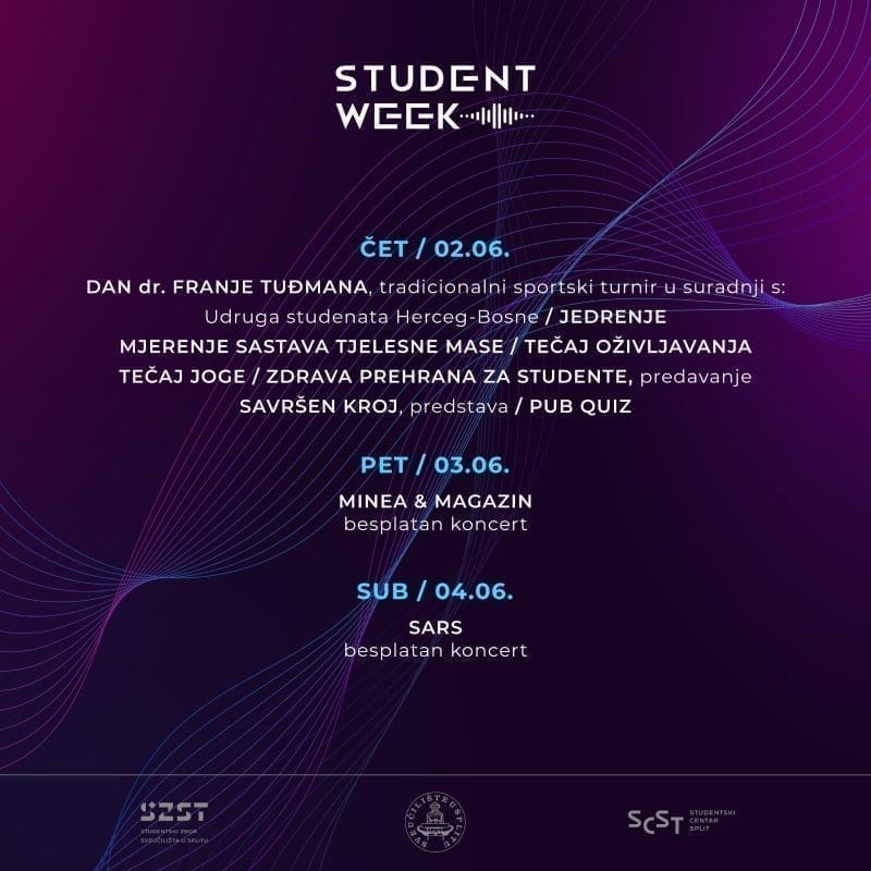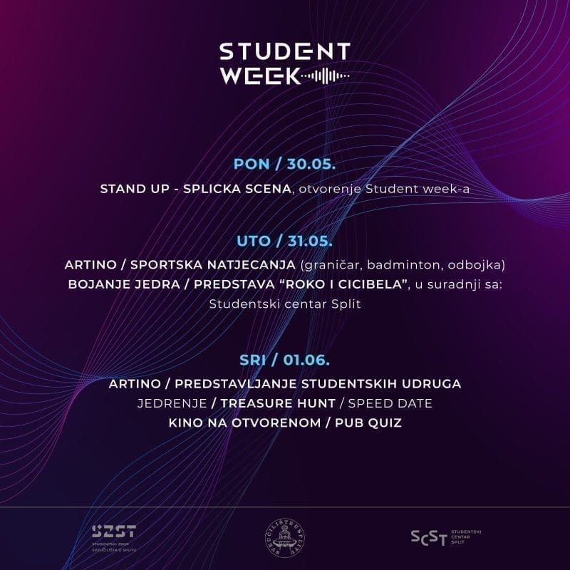Suorganizatori Student weeka su Sveučilište u Splitu i Studentski centar u Splitu. Detaljan program pročitajte u nastavku.