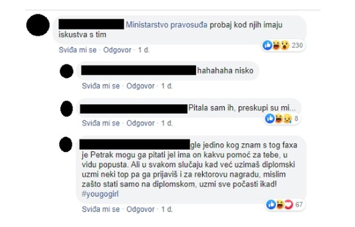 – Ali u svakom slučaju kad već uzimaš diplomski uzmi neki top pa ga prijaviš i za rektorovu nagradu, mislim zašto stati samo na diplomskom, uzmi sve počasti ikad! #yougogirl, napisala je djevojka.