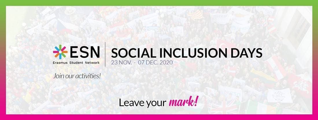 ESN organizira Social Inclusion Days (Dane socijalne uključenosti) kako bi među studentima koji su u naš grad došli na razmjenu podigli svijest o najugroženijima i upravo njima pružili pomoć. Dani socijalne uključenosti ove godine provode se između 23.11. i 7.12.2020. Tijekom ta dva tjedna više od 500 lokalnih udruge ESN-a promovirat će aktivnosti kojima je cilj integriranje međunarodnih studenata u lokalne zajednice i obrnuto.