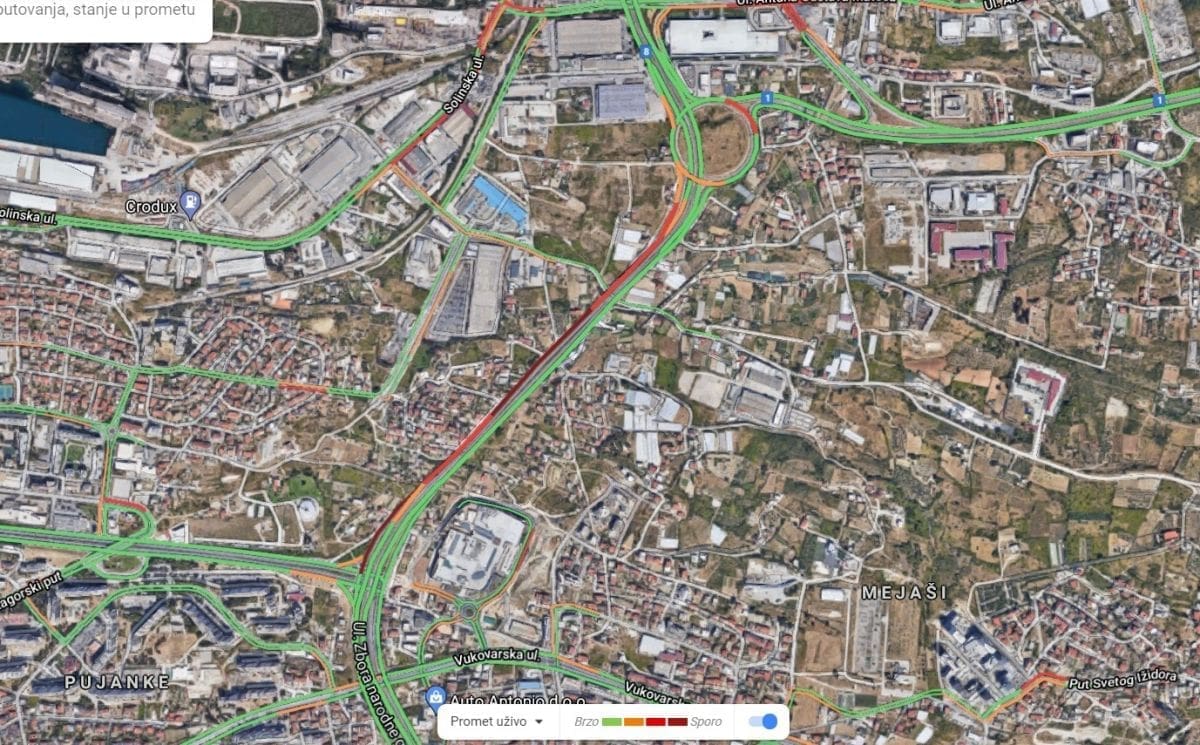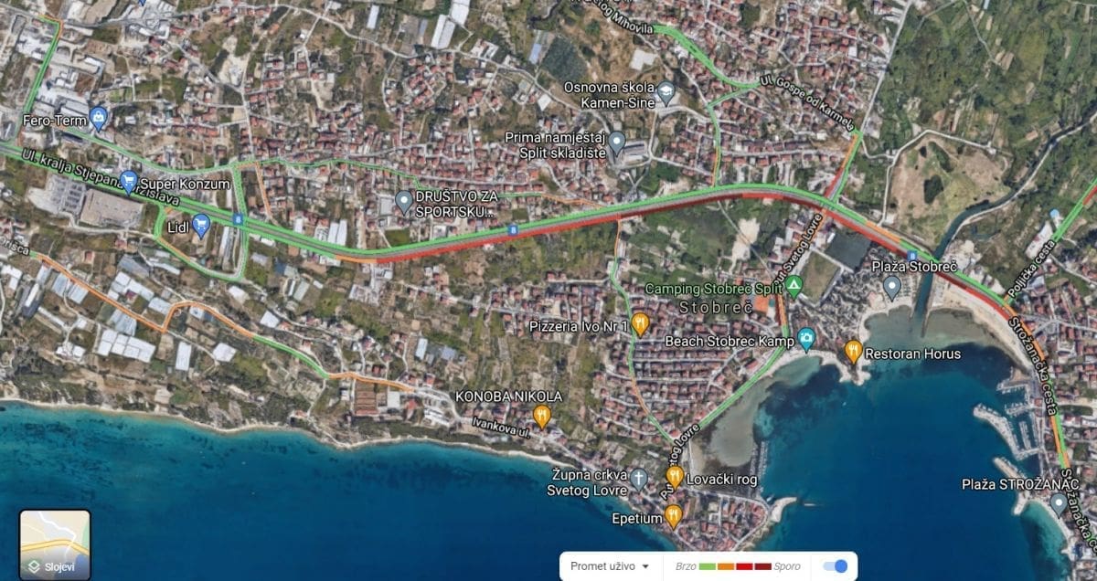 Iza 14 sati velike gužve se stvaraju na izlazu iz Splita, niz Sirobuju u smjeru Podstrane. Kolona se proteže od nadvožnjaka na Sirobuji do skretanja za TTTS.