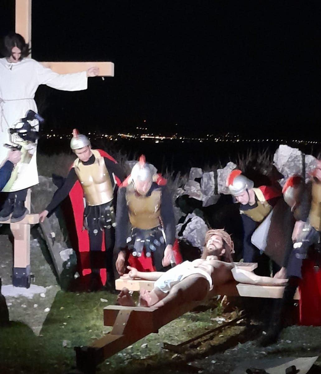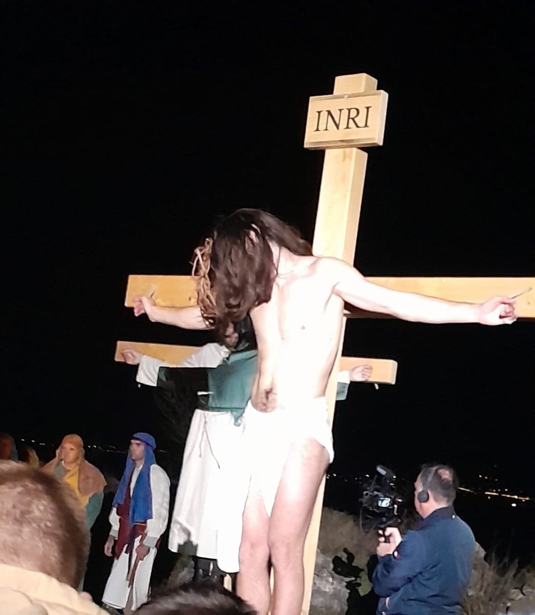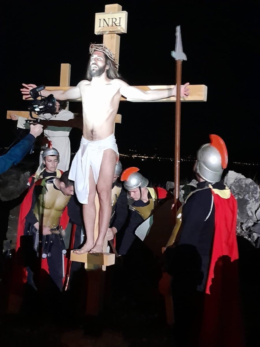 Lik Isusa Krista utjelovljuje mladi akademski glumac Stipe Gugić, koji je izvrsno odigrao ovu zahtjevnu ulogu. Unatoč niskim temperaturama, scenu raspeća na križu, Gugić izvodi oskudno odjeven, golim torzom i nogama.