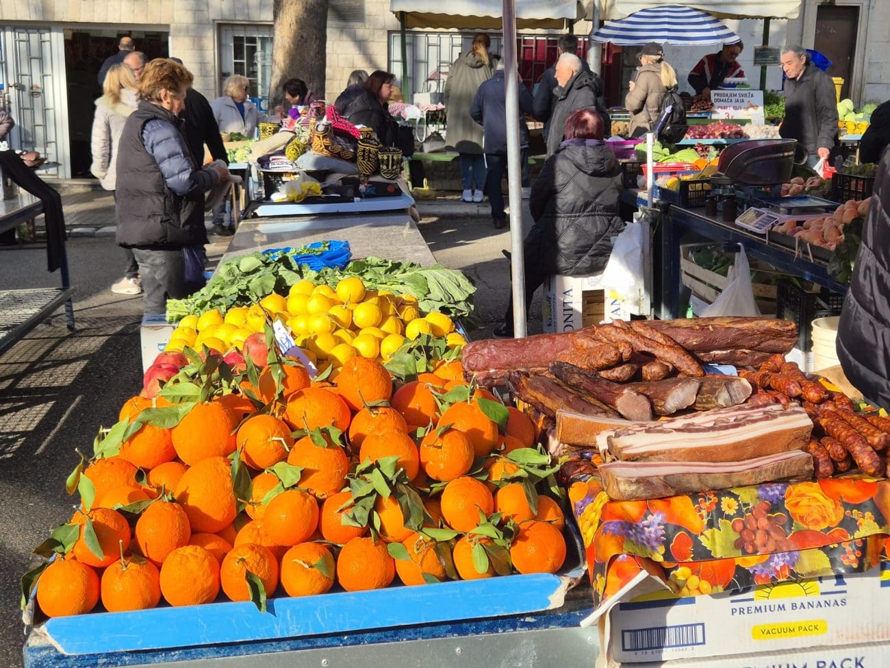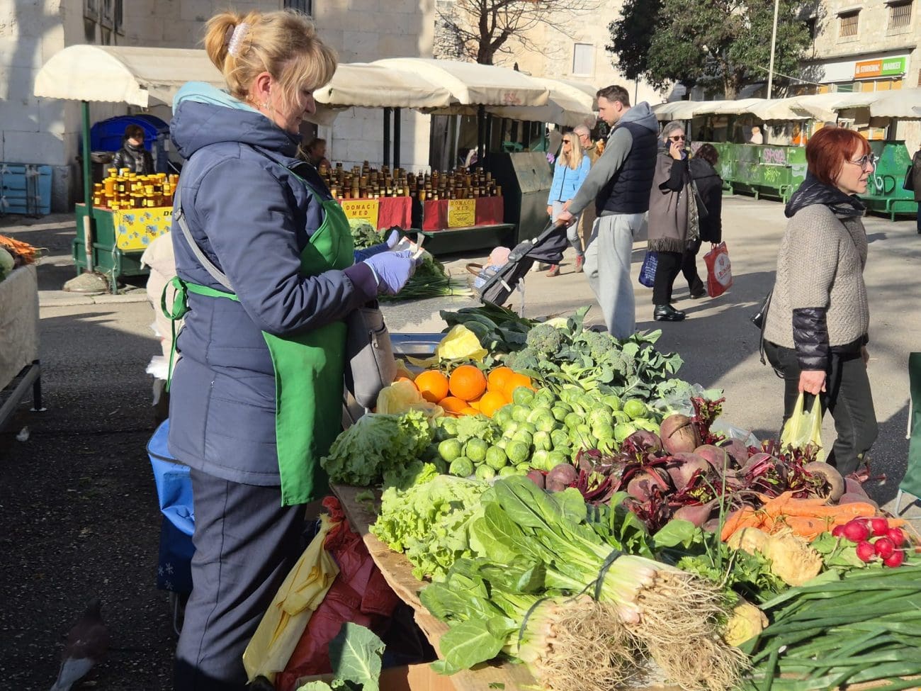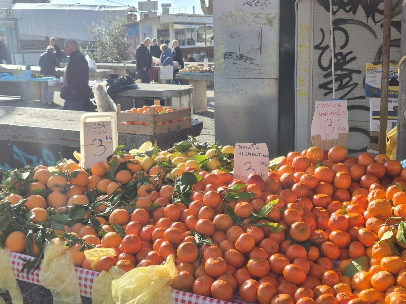 Na većini štandova dominira sezonsko voće, a agrumi su ovog vikenda posebno traženi. Mandarine se nude po cijeni od 1,5 eura po kilogramu, dok su klementine nešto skuplje — 3 eura. Naranče stoje 3 eura po kilogramu, a limun se prodaje po 2,5 eura.