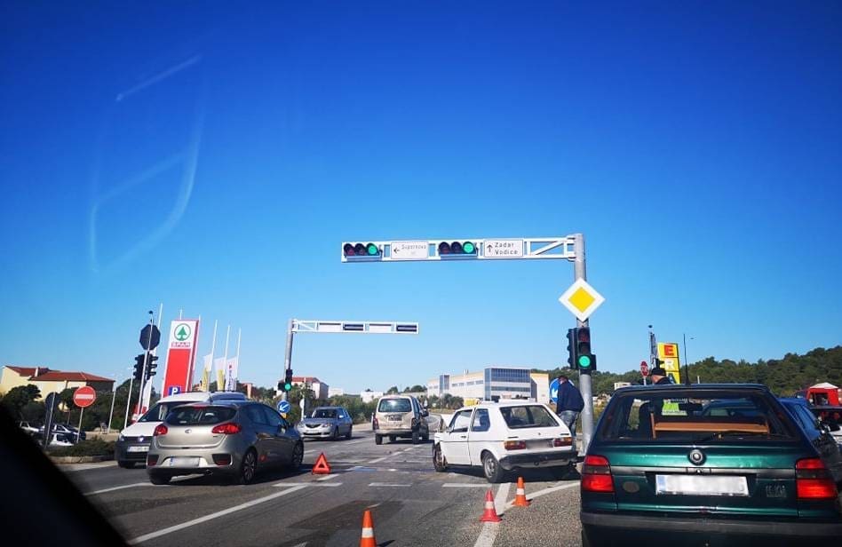Danas se oko 10 sati dogodio sudar Golfa i Berlinga na semaforu kod Supernove u šibenskim Njivicama. U nesreći je samo zabilježena materijalna šteta na vozilima.