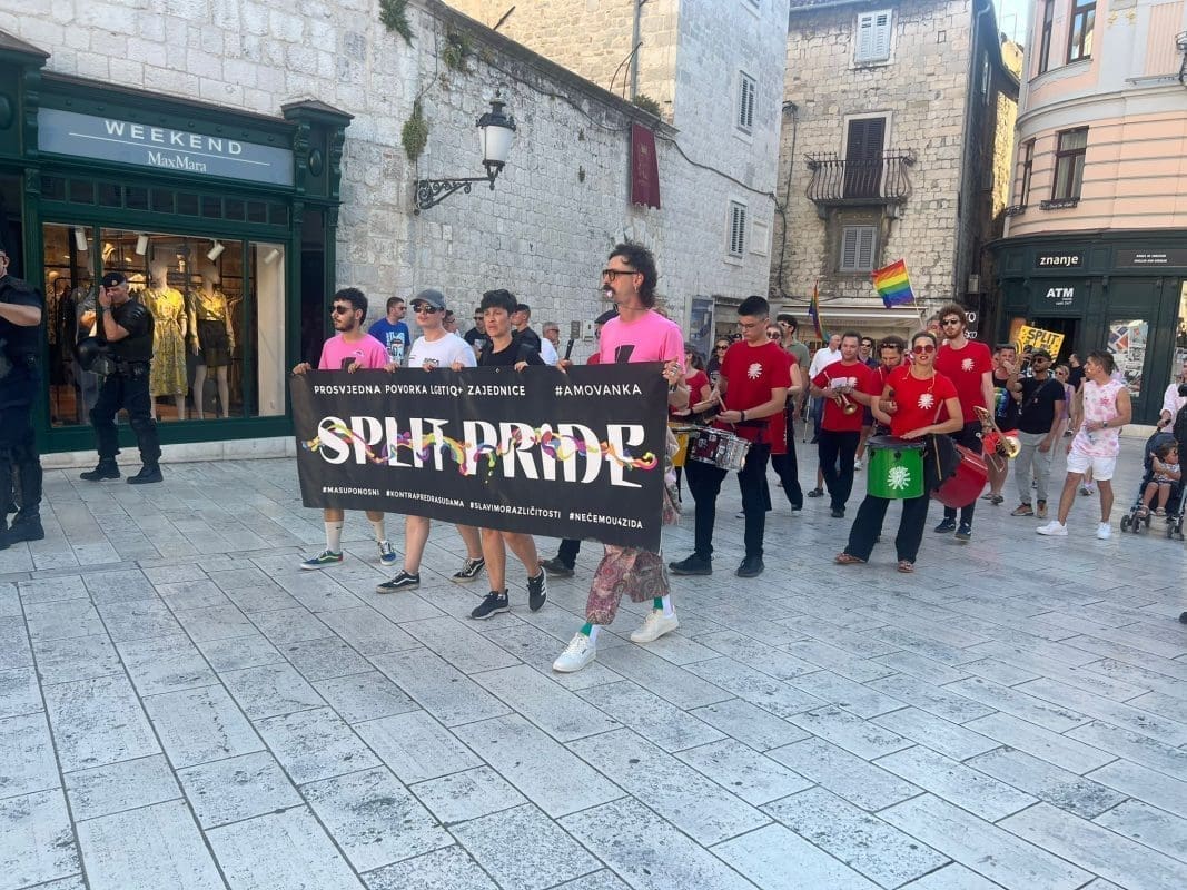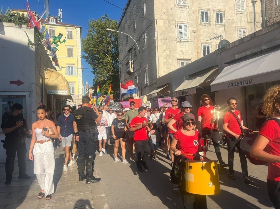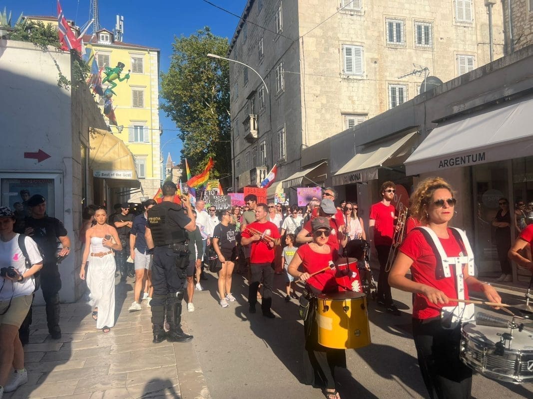 Iz povorke odjekuju zvuci bubnjeva i saksofona, svi su sjajno raspoloženi. Turisti koji su se zatekli na mjestima kojima povorka prolazi zainteresirano su ih promatrali, utiho pitaju što se događa iako se po zastavi duginih boja da naslutiti.