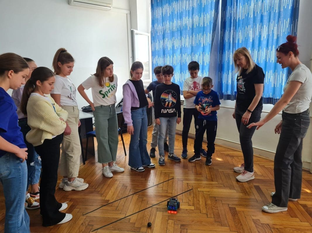 5. svibnja, održane su prve dvije radionice - radionica robotike i radionica modelarstva. Radionicom robotike obuhvaćeni su teorijski sadržaji usko vezani uz praktični dio - izrada programa za pokretanje robota mBot2. Učenici su savladali izradu kodova za kretanje, a potom su uspomoć mobitela, preko bluetooth veze, upravljali robotom u utrci dvaju robota unutar zadane staze te u "kuglanju" - odguravanju crne loptice do kraja staze, na način da se loptica zadrži unutar označenih linija.